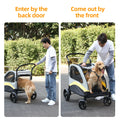 Dogs enter the stroller by the rear door, come out from the front.
