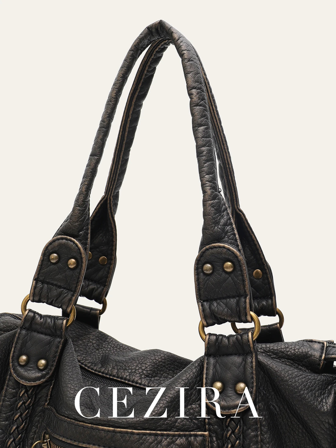 Vintage Washed PU Leather Large Capacity Tote Zip Pockets Braid Decor Shoulder Cross body Bag Unisex Women Daily Travel Handbag