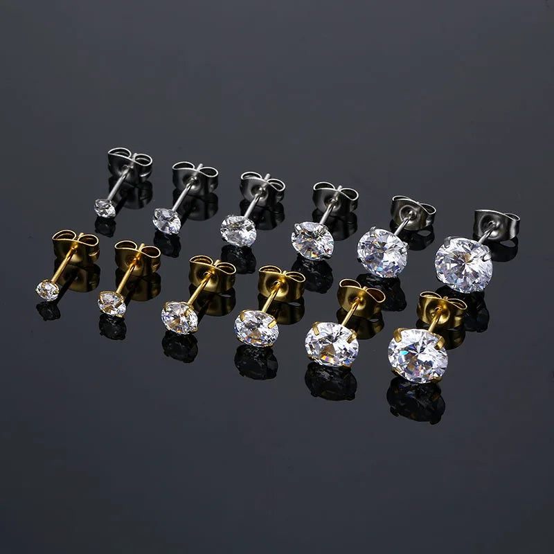 1 Pair 3-8mm Classic Round/Flat Back Screw Stud Earrings for Women/Men Stainless Steel Shiny Zircon Crystal Piercing Jewelry