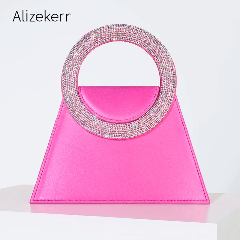 Bling Rhinestone Satin Handbags Women 2023 Elegant Boutique Round Crystal Handle Trapezoid Evening Clutch Purses Wedding Party