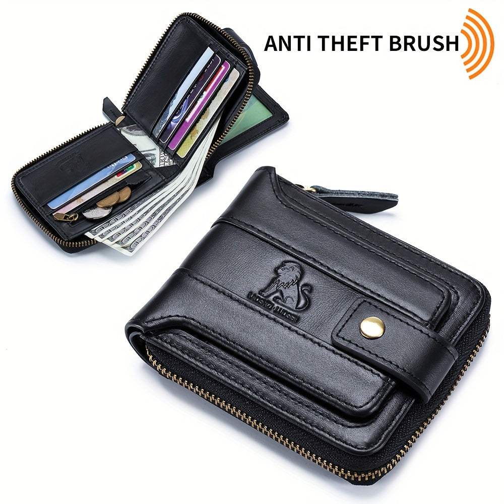 Men's Retro Genuine Leather Multi-Card Wallet with Zip, Large Capacity, Anti-Theft