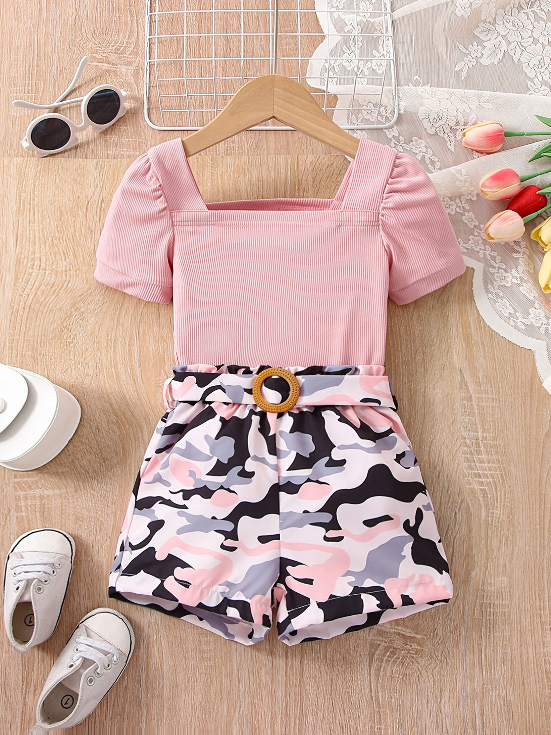 2pcs Girls Puff Sleeve Square Neck Top & Belted Camouflage Shorts Set Kids Summer Clothes