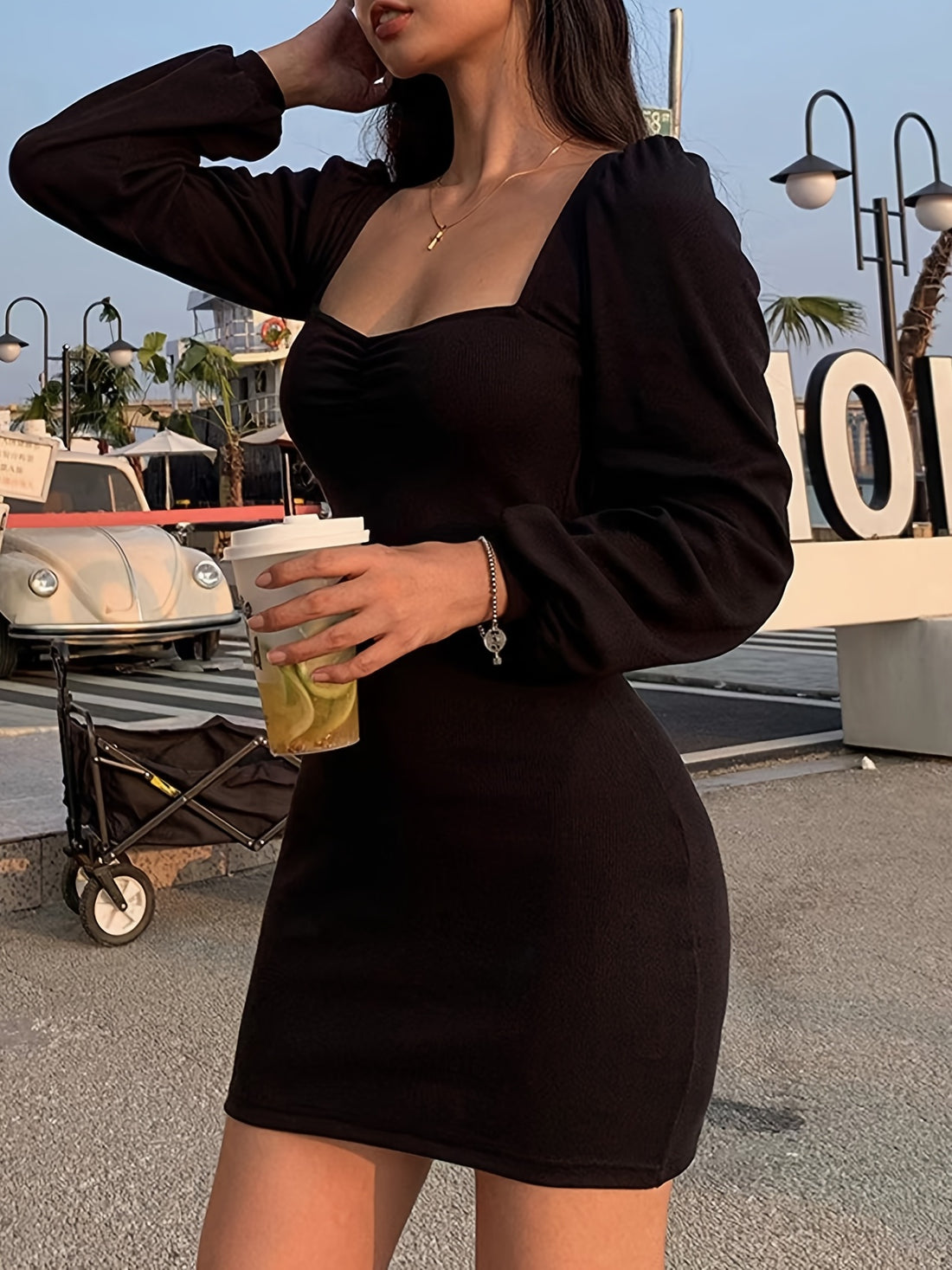 Squared Neck Lantern Sleeve Dress, Casual Solid Bodycon Bag Hip Dress, Women's Clothing