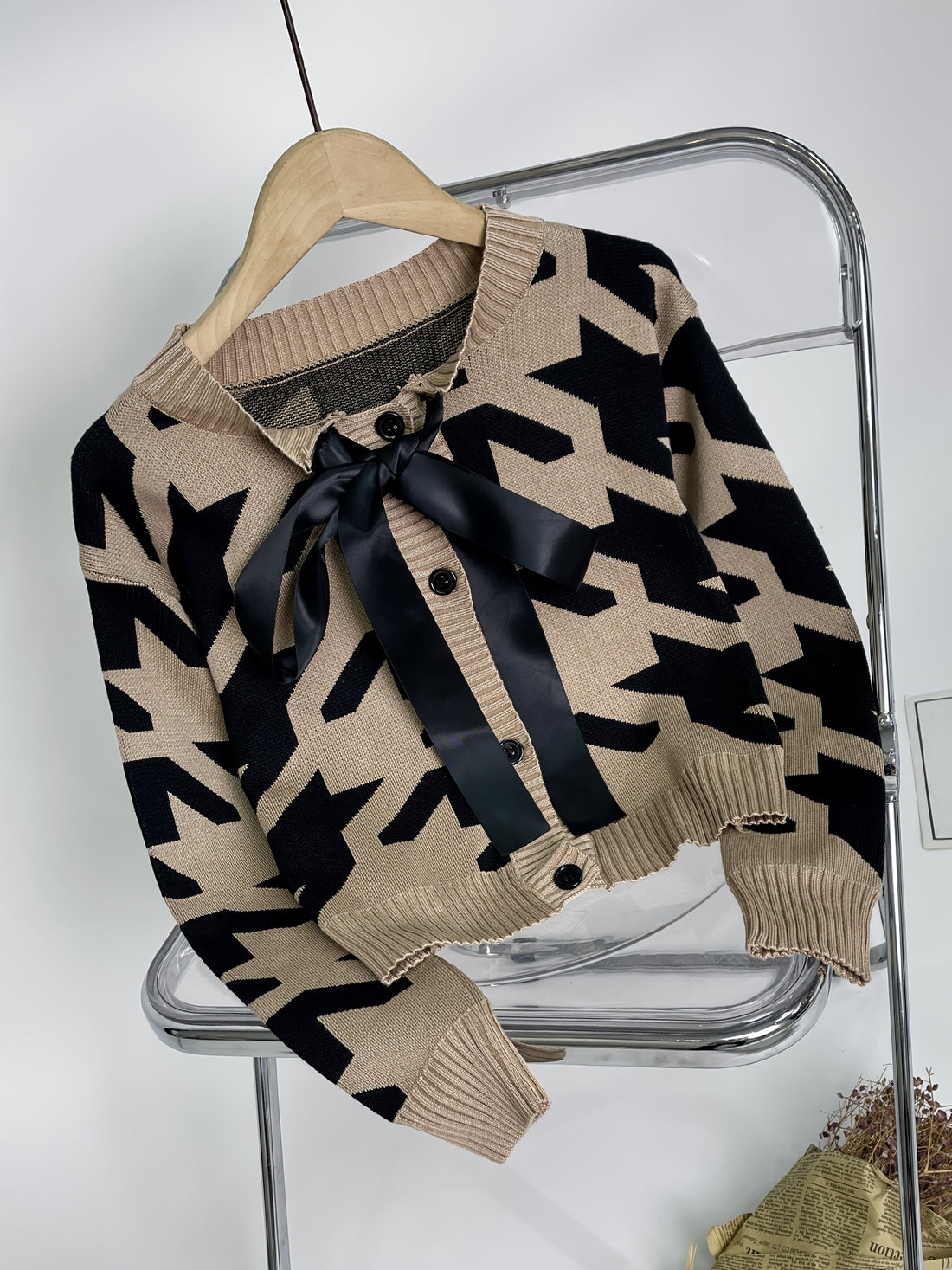 Color Block Bowknot Button Front Cardigan, Preppy Long Sleeve Loose Sweater For Spring & Fall, Women's Clothing