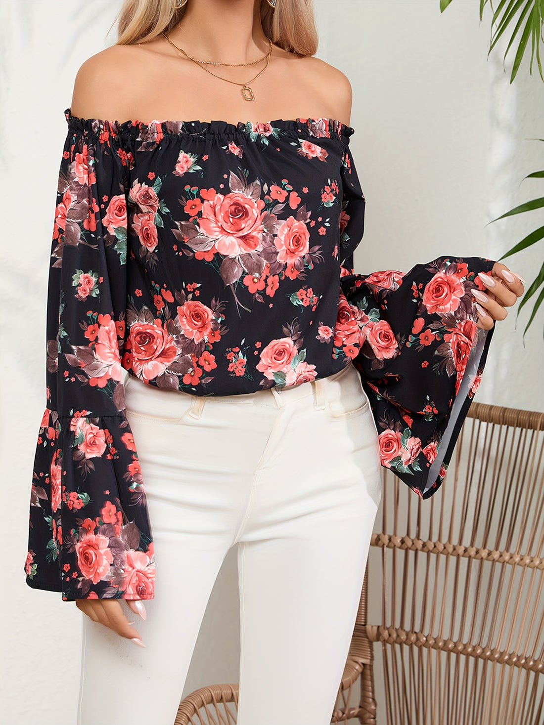 Elegant Boho Chic Floral Off-Shoulder Top - Long Flutter Sleeves, Non-Stretch, Machine Washable for Women