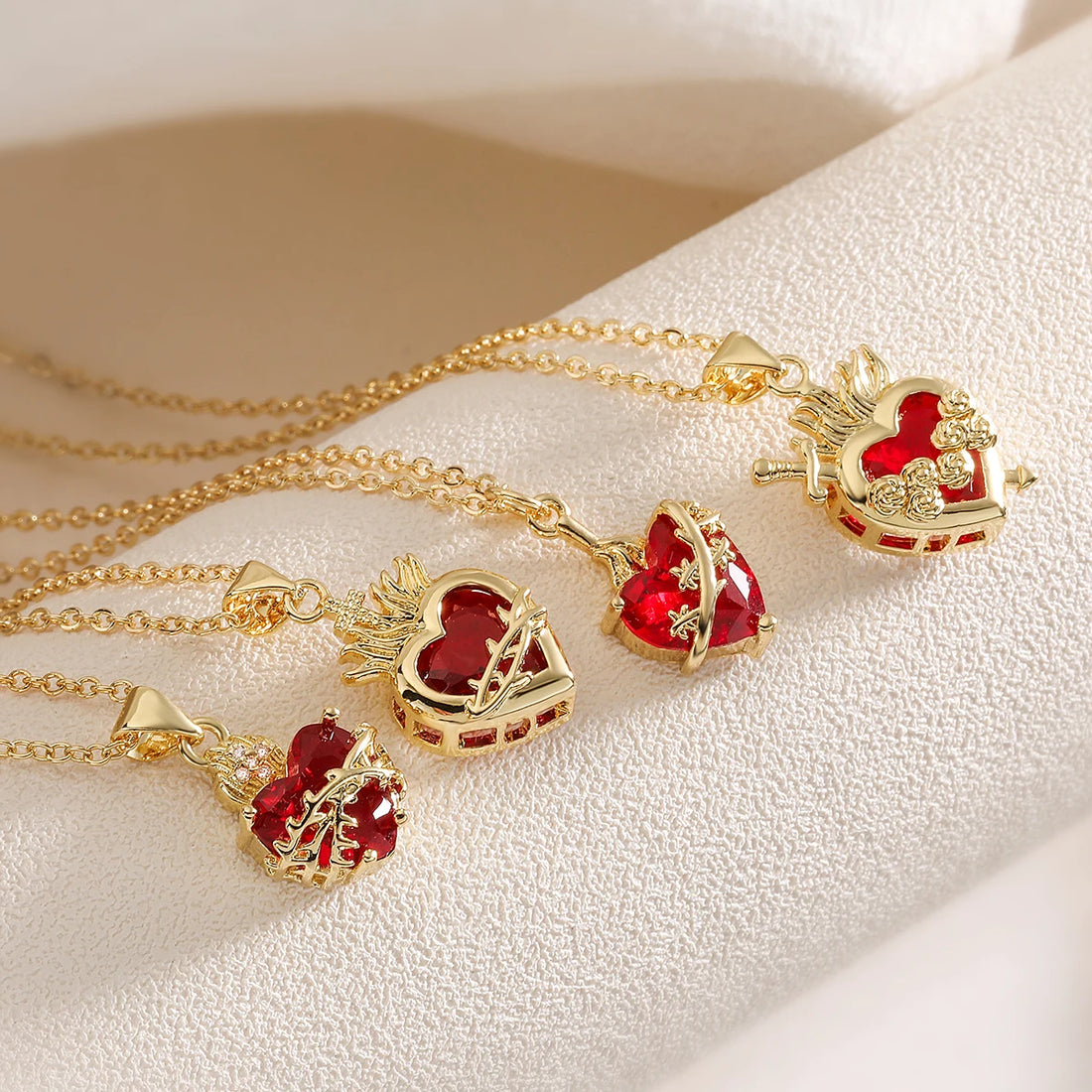 NEWBUY Fashion Gold Color Chain Red Crystal Heart Pendant Necklaces For Women Bling Bling Jewelry