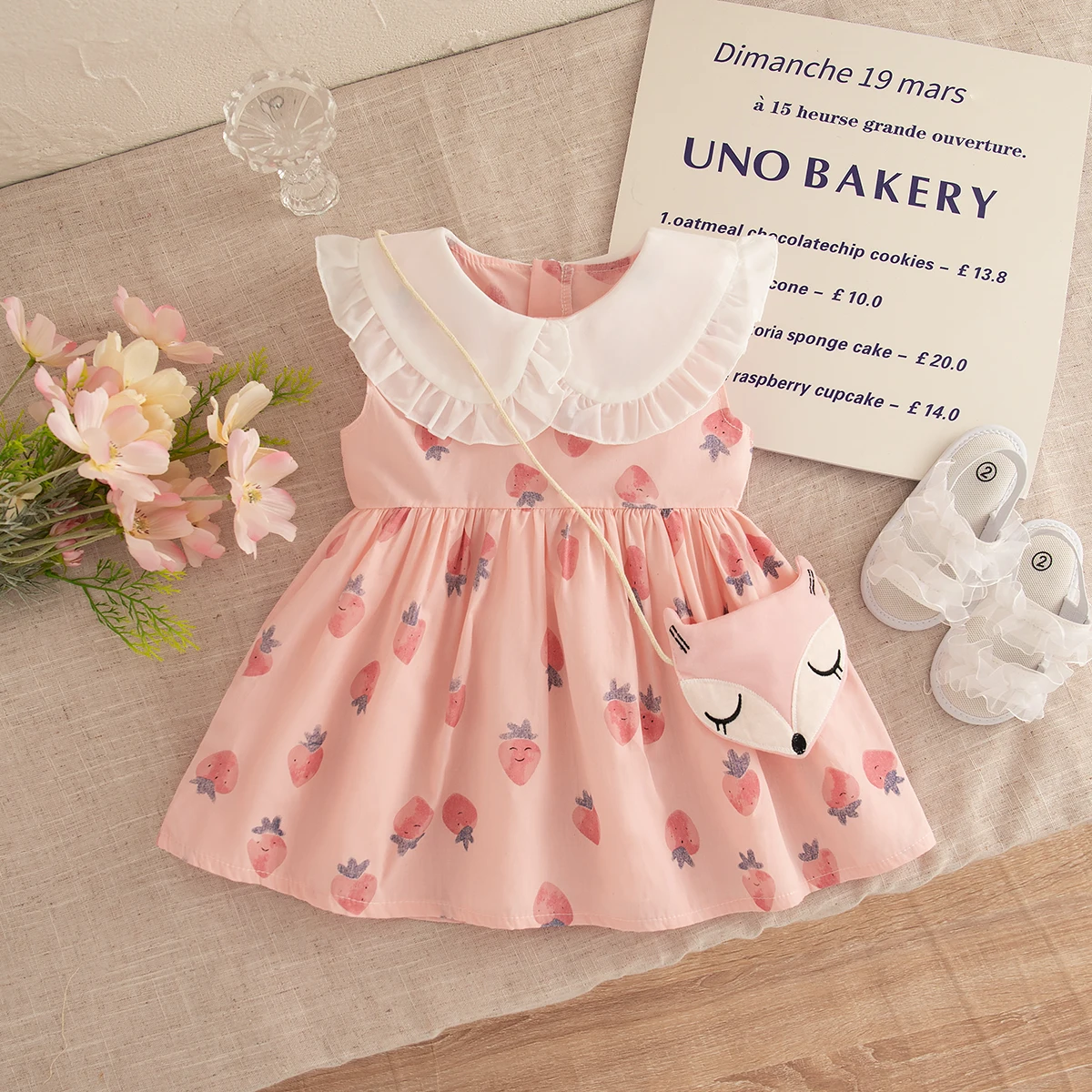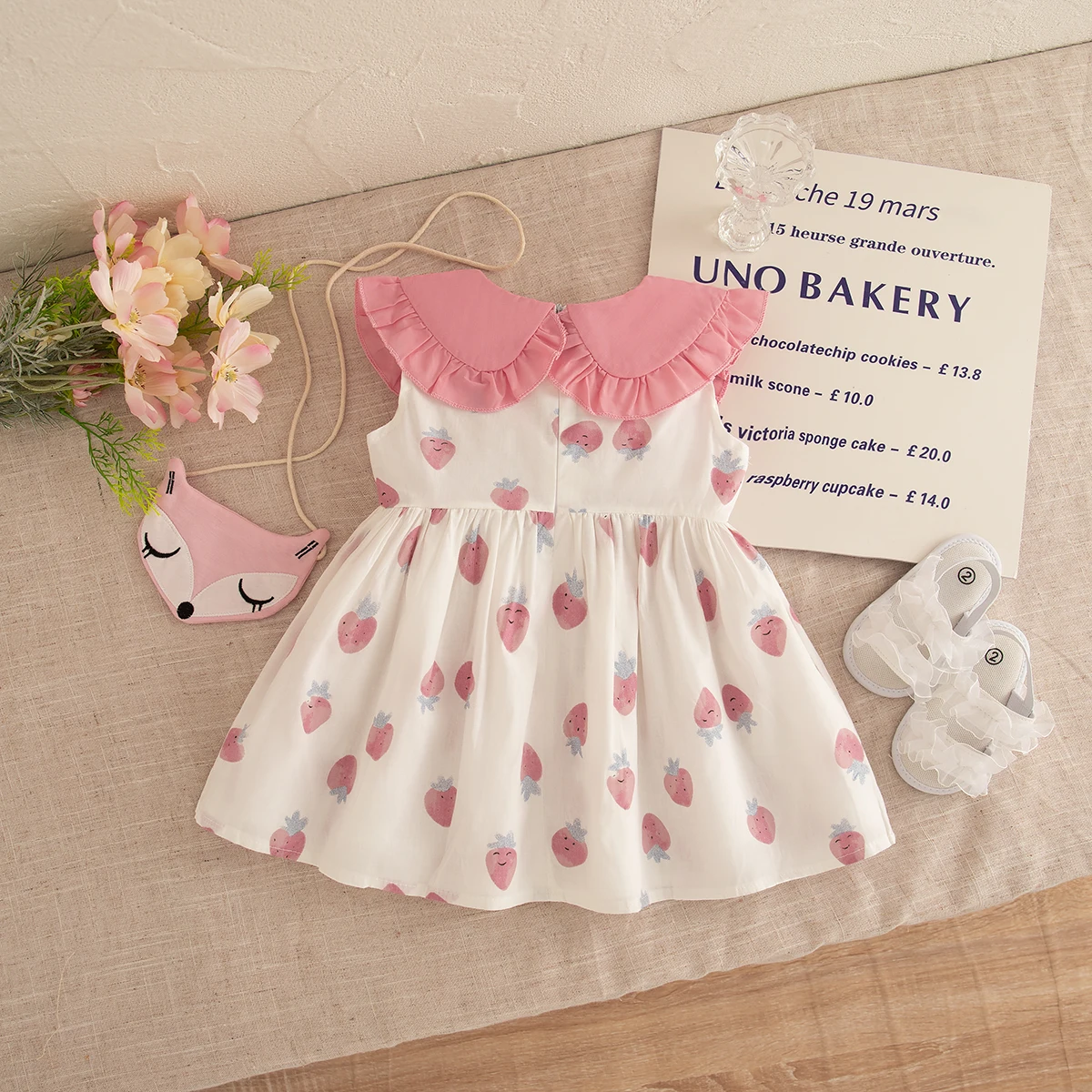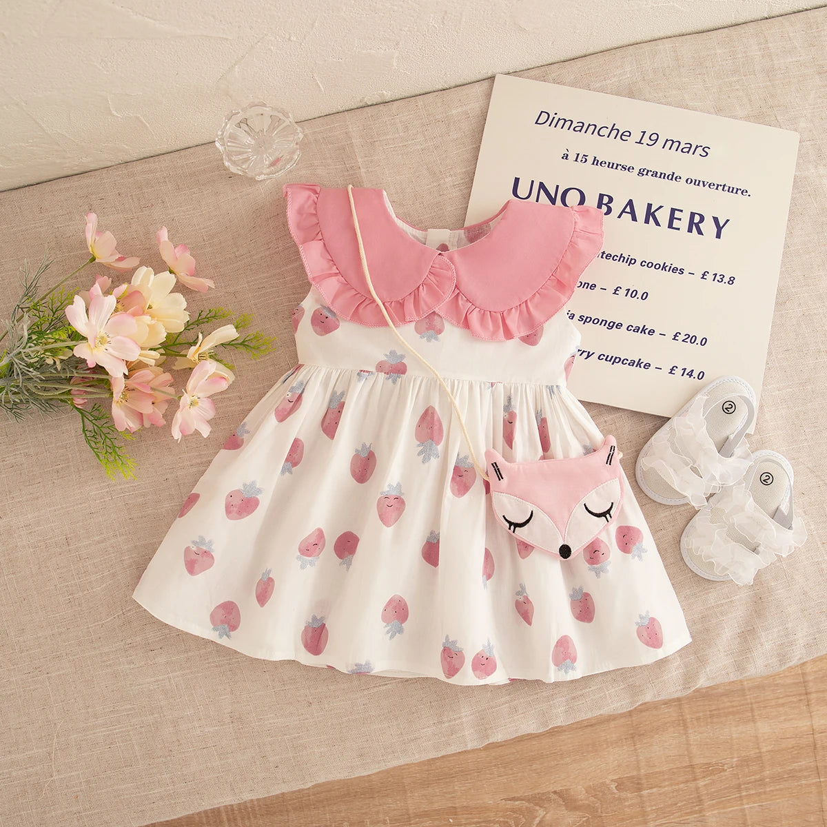 (0-3 Year Old Baby Girl Dress) Summer New Sweet Pink Strawberry Children'S Sleeveless Clothes With Fox Pendant As A Gift