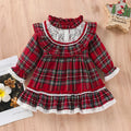 1 to 7 Years Christmas Girls Casual Dress Plaid Lace Patchwork Stand-Up Collar Flounce Long Sleeve Dress with Ruffle Hem