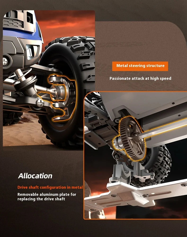 10. Metal components: metal underbody reinforcement plate, metal front CVD, metal rear dog bone and wheel cup, metal differential, powder gear, metal steering knuckle, metal front and rear arm code, metal middle transmission shaft;