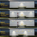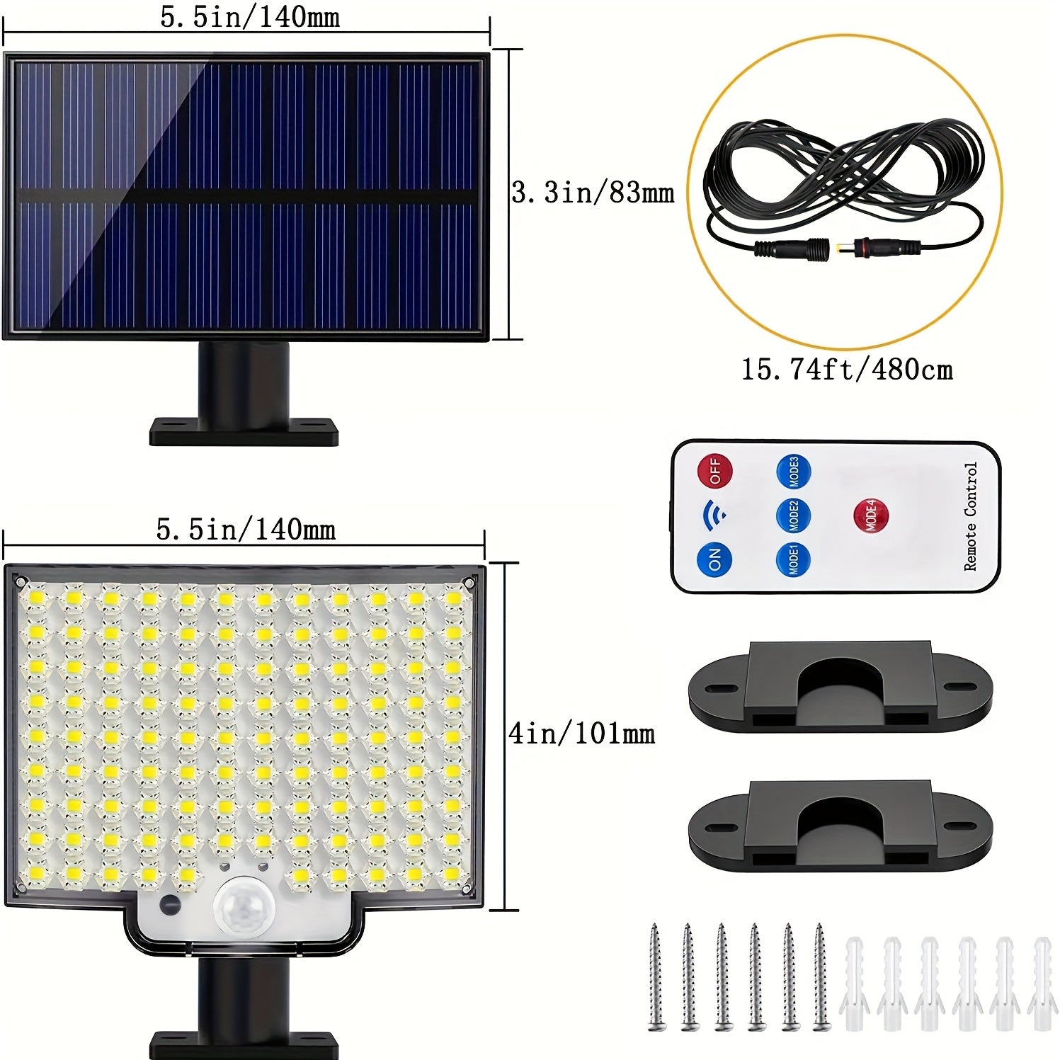【Four Modes Adjustable】Four adjustable modes by pressing the button on the back of the solar outdoor light and the remote. Mode 1: Auto on at night, and motion sensor off. Mode 2: Strong light of 15s when motion is detected, and low light after people leave. Mode 3: Strong light of 15s when motion is detected, and turn off after people leave. Mode 4: Light fashes at night.