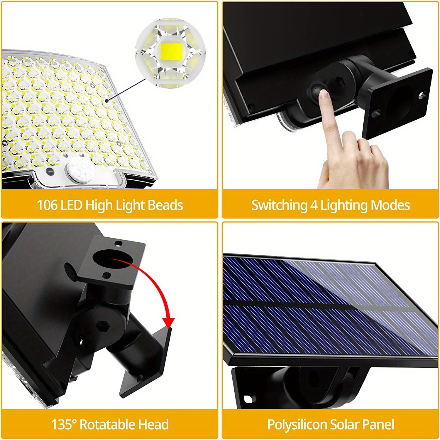 【Super Bright Light Beads】Equiped with 106 LED high light beads and an illumination of 180° wide, the solar lights outdoor can provide 500sq.ft and 3000LM lighting. 3000mAh lithium battery has a larger capacity to provide more efficient charging and more lasting lighting.