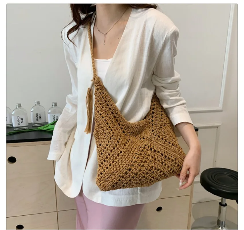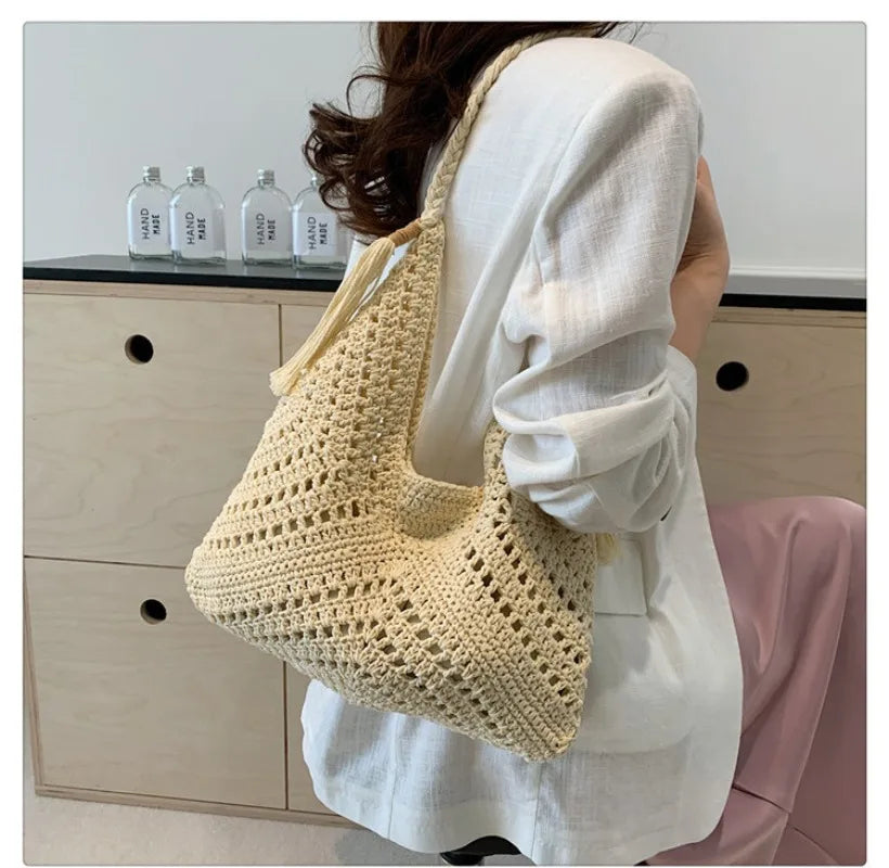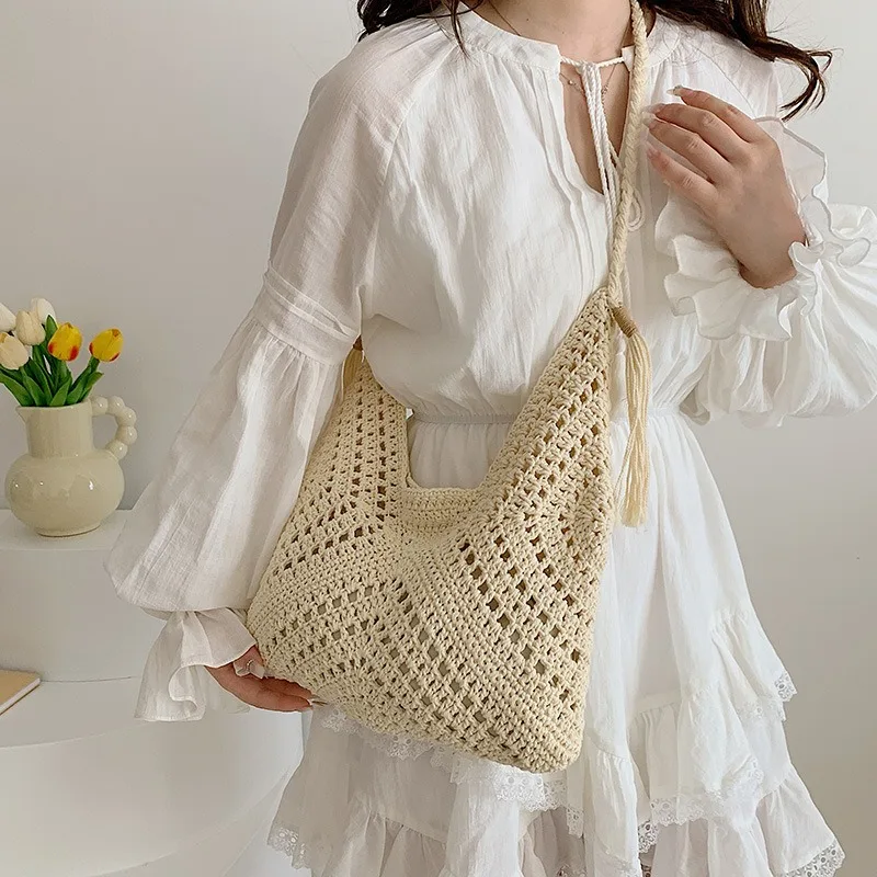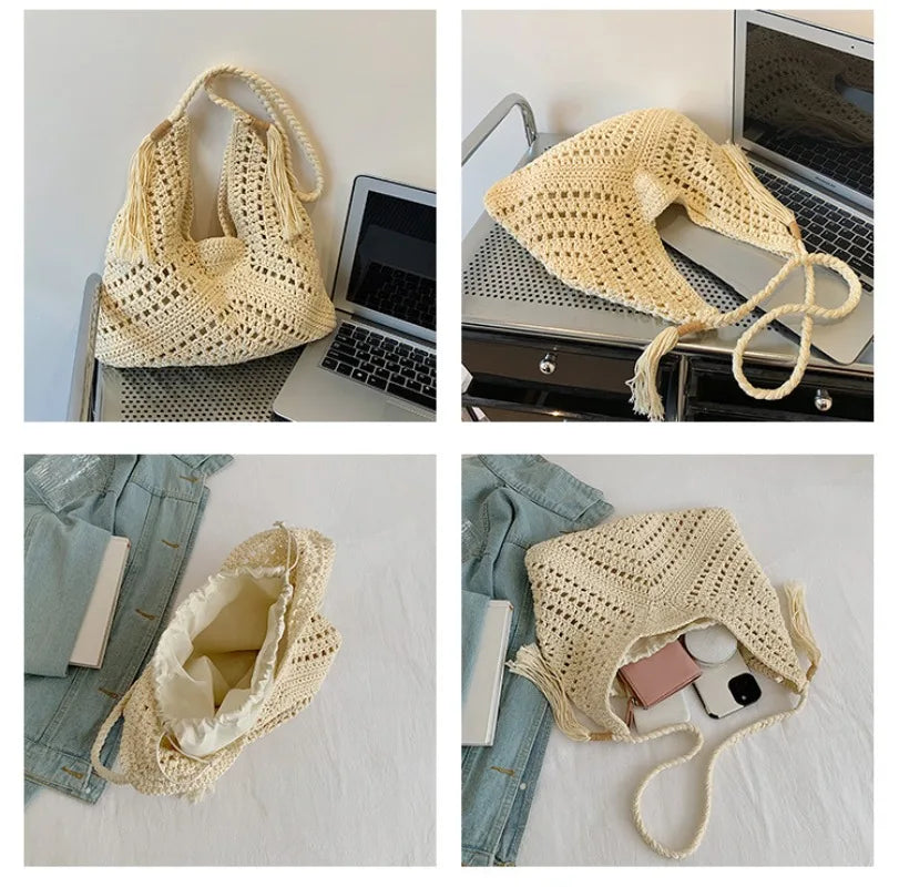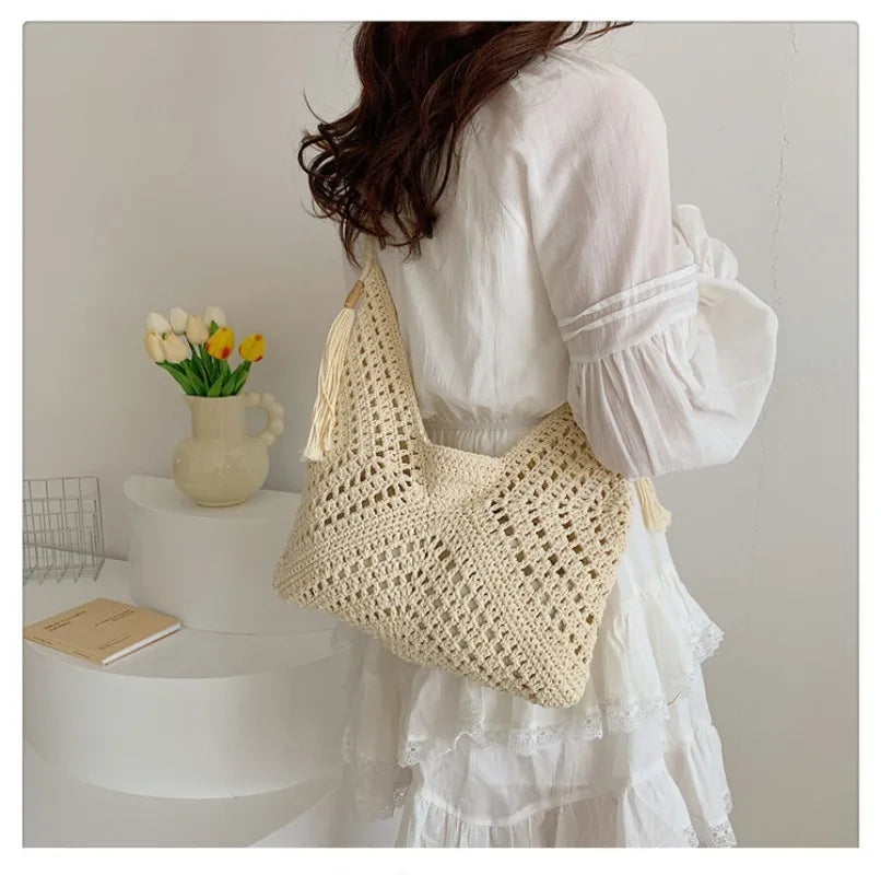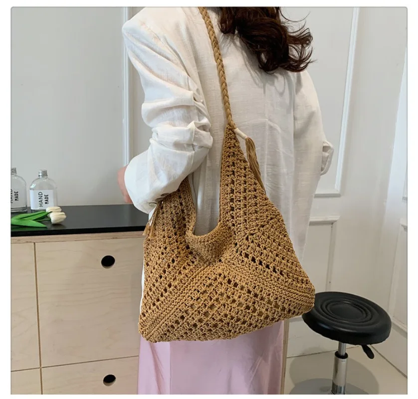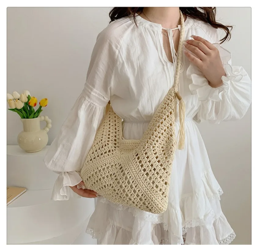 2025 Bohemian Crochet Straw Tote with Drawstring Pocket, Beach Festival Shoulder Bag for Women