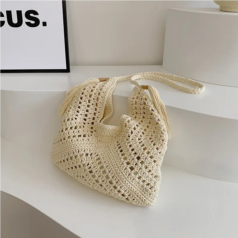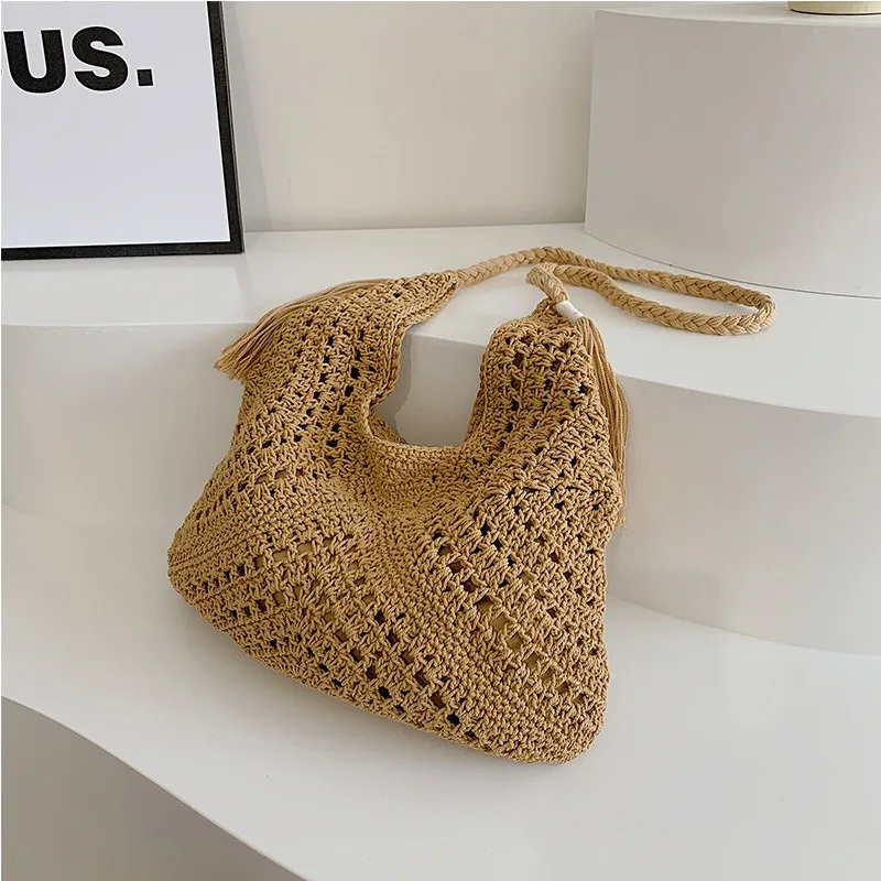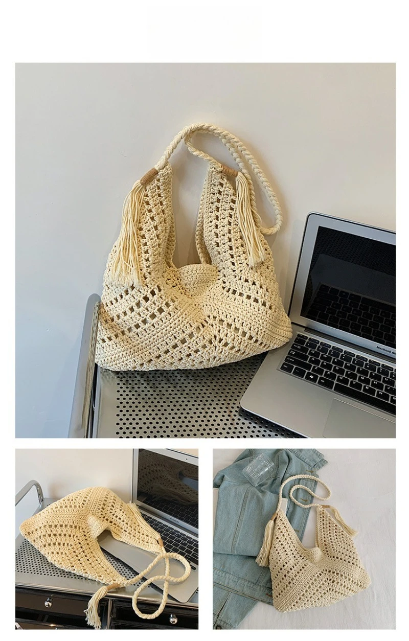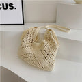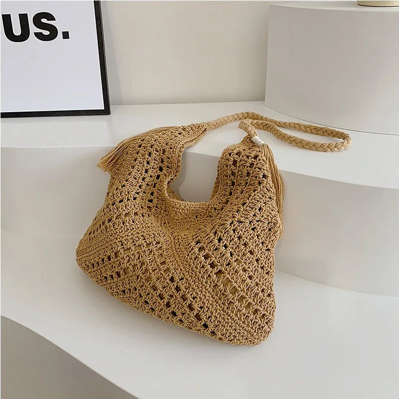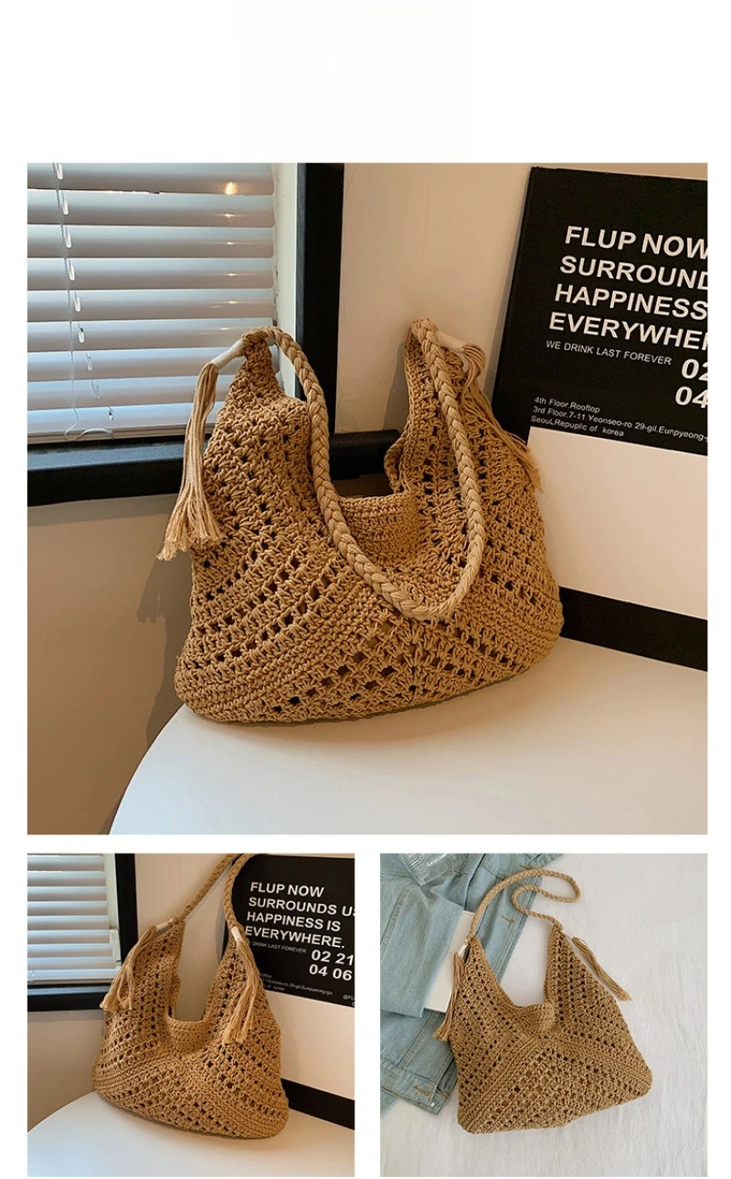 2025 Bohemian Crochet Straw Tote with Drawstring Pocket, Beach Festival Shoulder Bag for Women