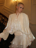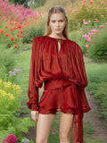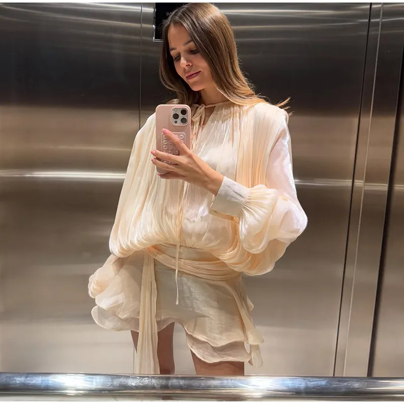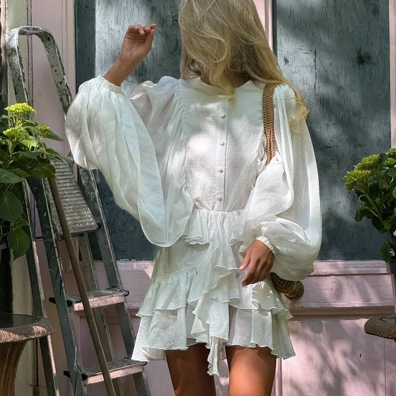 2025 Summer Women Chic Mini Dress Single Breasted Layered Ruffle O-neck Lantern Sleeves Party Dresses Elegant Lady Short Vestido