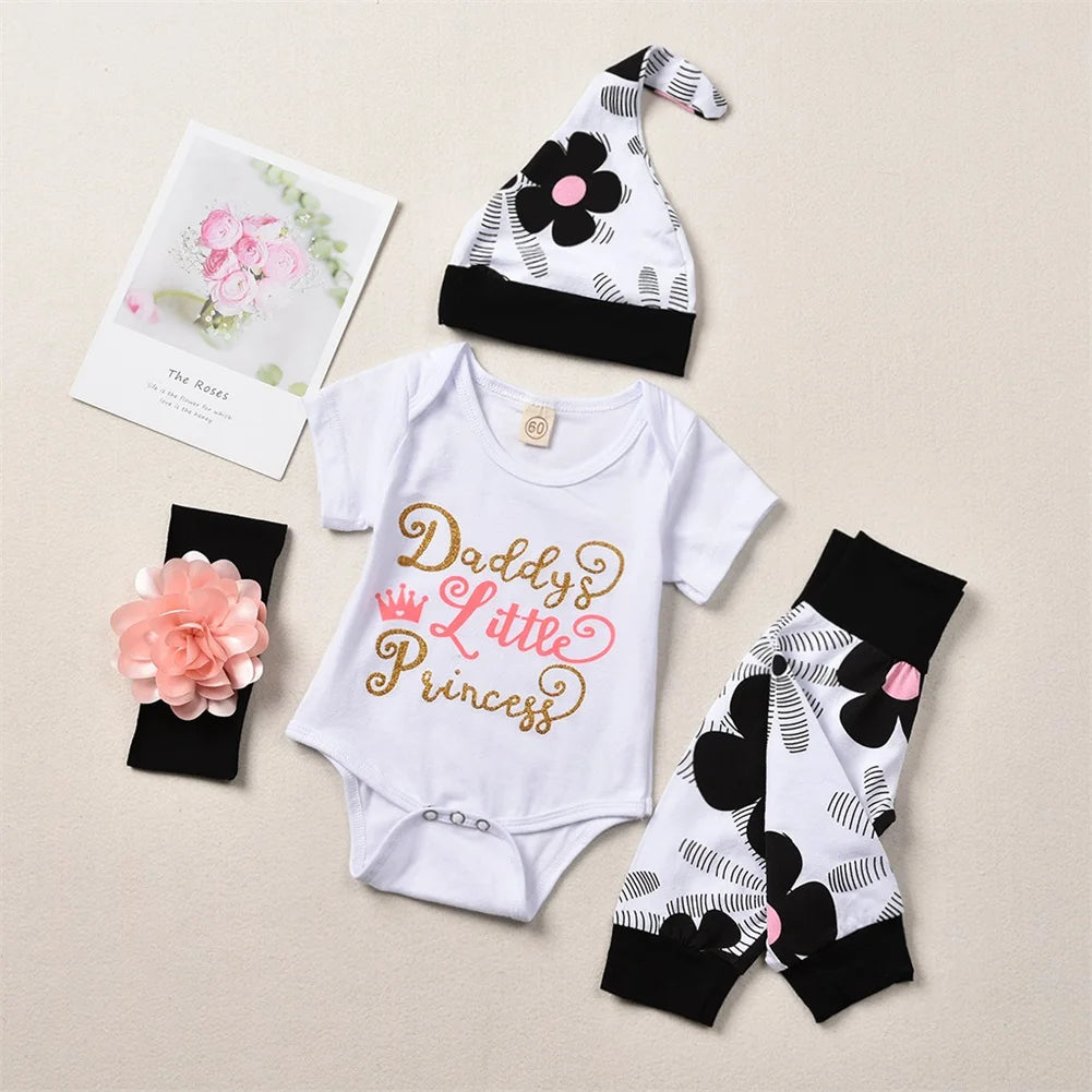 4Pcs Newborn Baby Girls Summer Clothes Sets Short Sleeve Romper Tops + Floral Pants + Hat +Headband Baby Outfits 0-24M