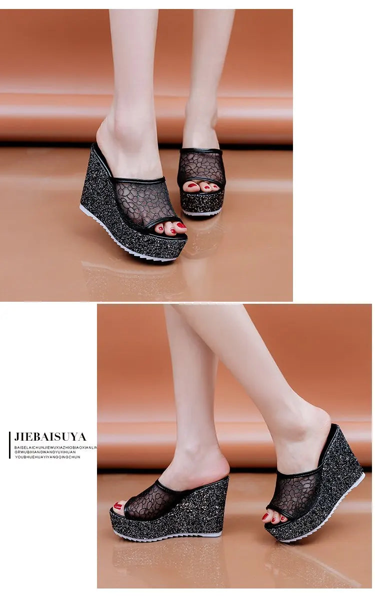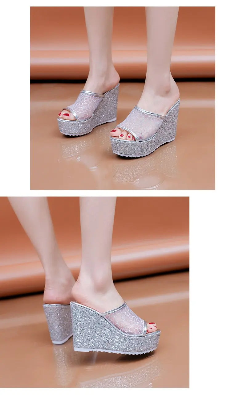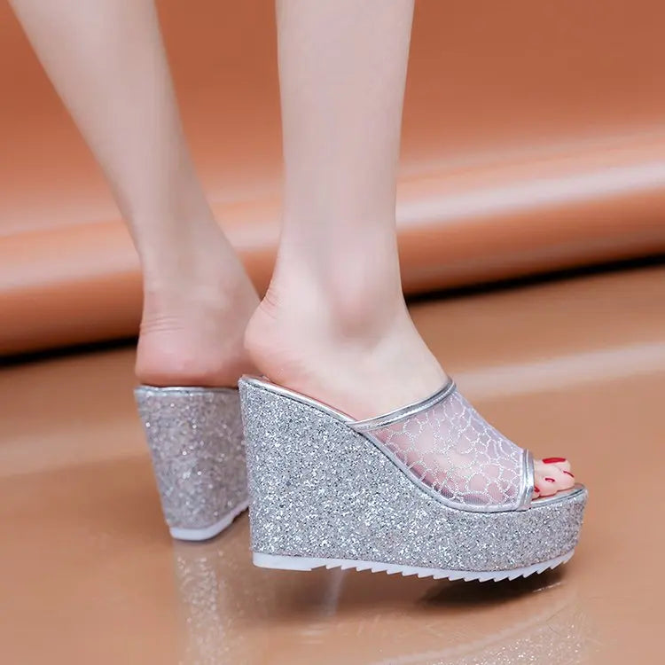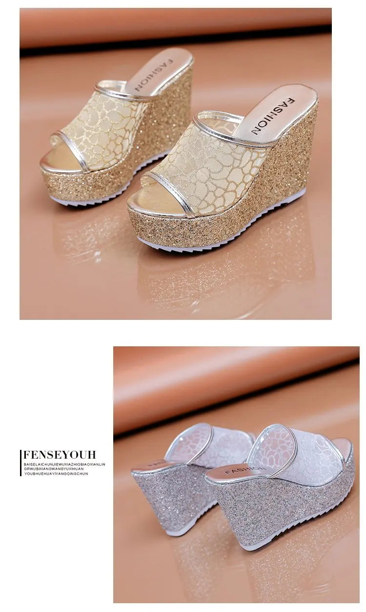 Bling Golden Women Slippers Summer Shoes Platform 4cm Outside Fitting-room 11cm High Heels Wedges Solid Mesh Female Sliver Shoes