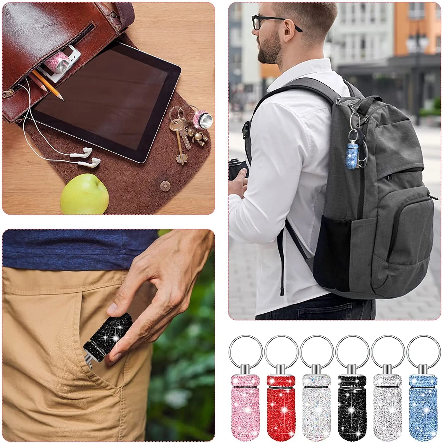 The Key Ring Pill Case Includes 6 Different Colors, Convenient For You To Distinguish. The Bling Rhinestone Design Can Also Match Most Types Of Clothes, And Shiny In The Sun, Easy To Be Noted In Emergency.