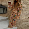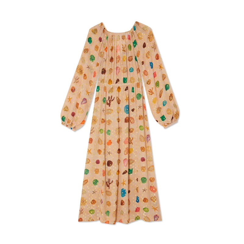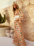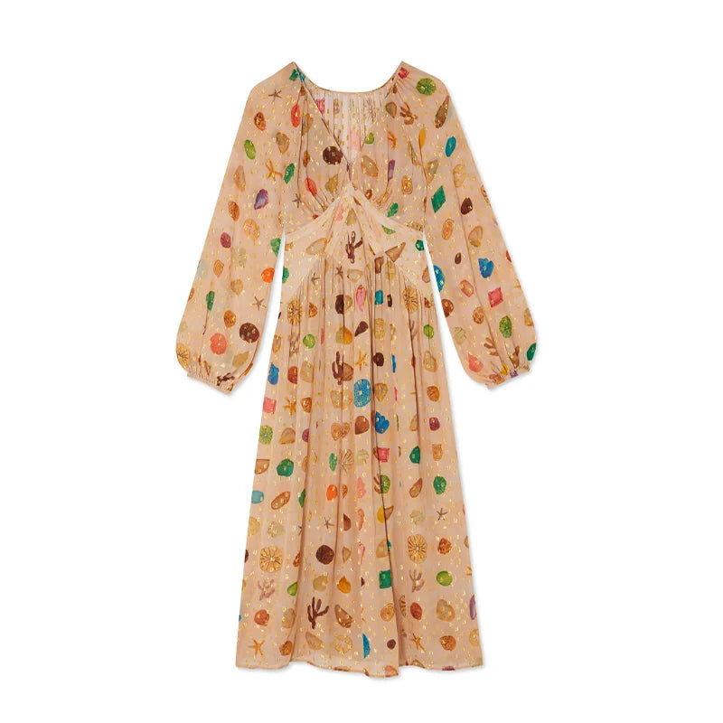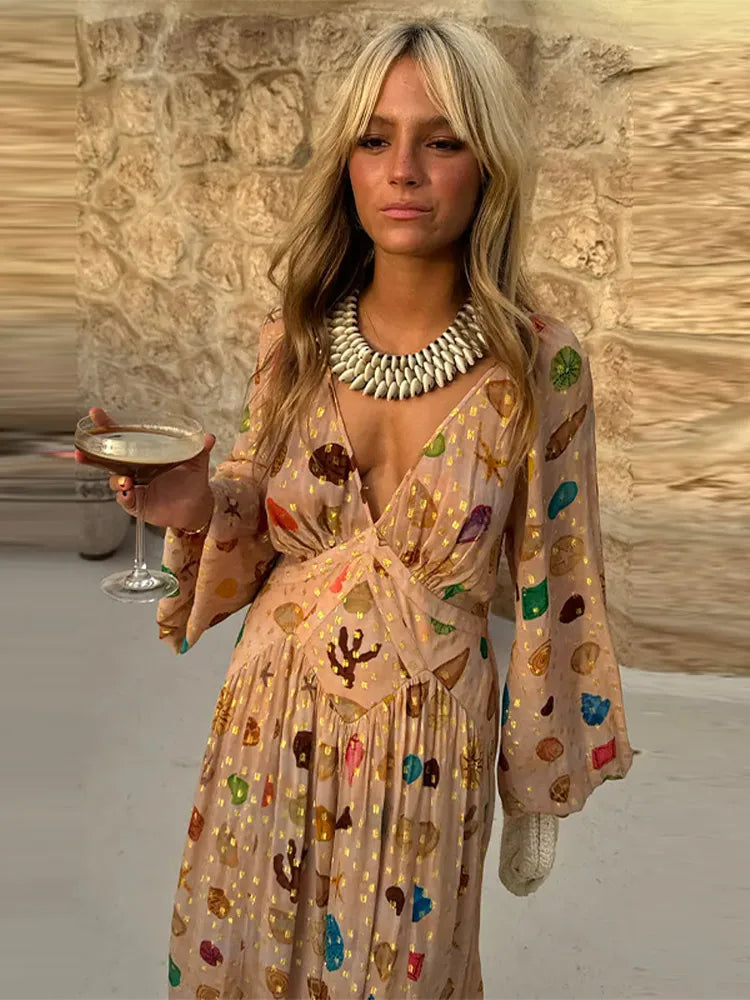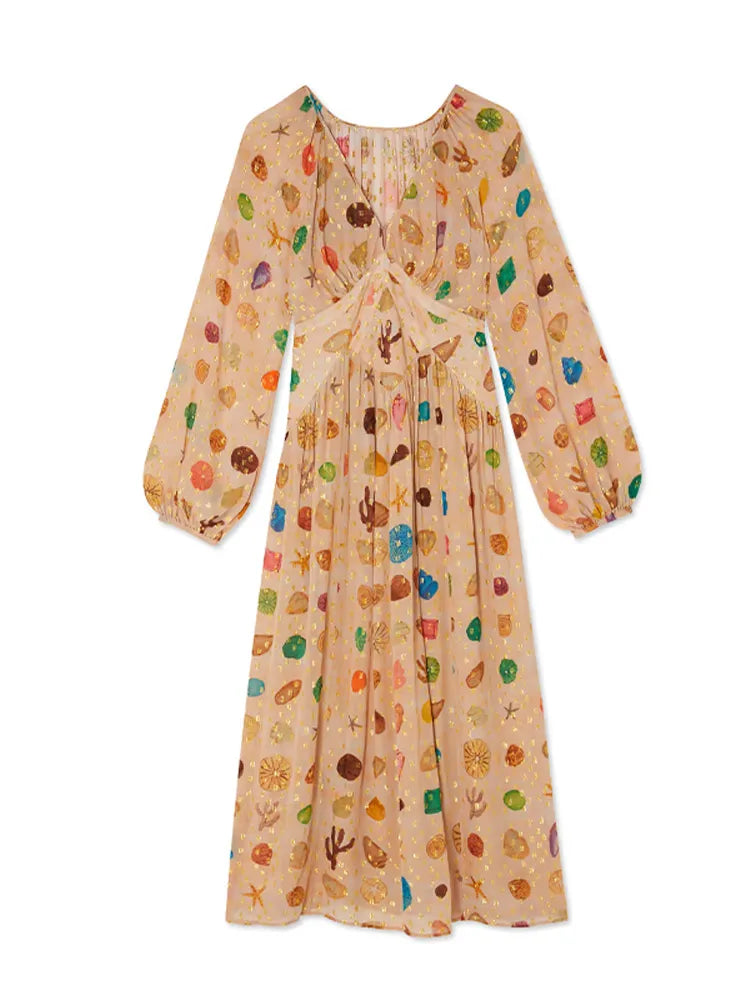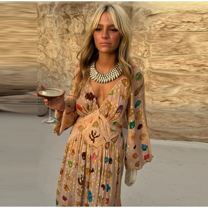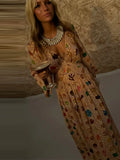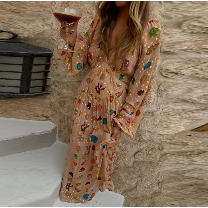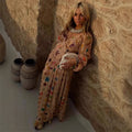 Bohemian Printed Patchwork Maxi Dress For Women Elegant Puff Full Sleeve V-neck A-line Dress Lady 2025 Autumn Beach Party Robe
