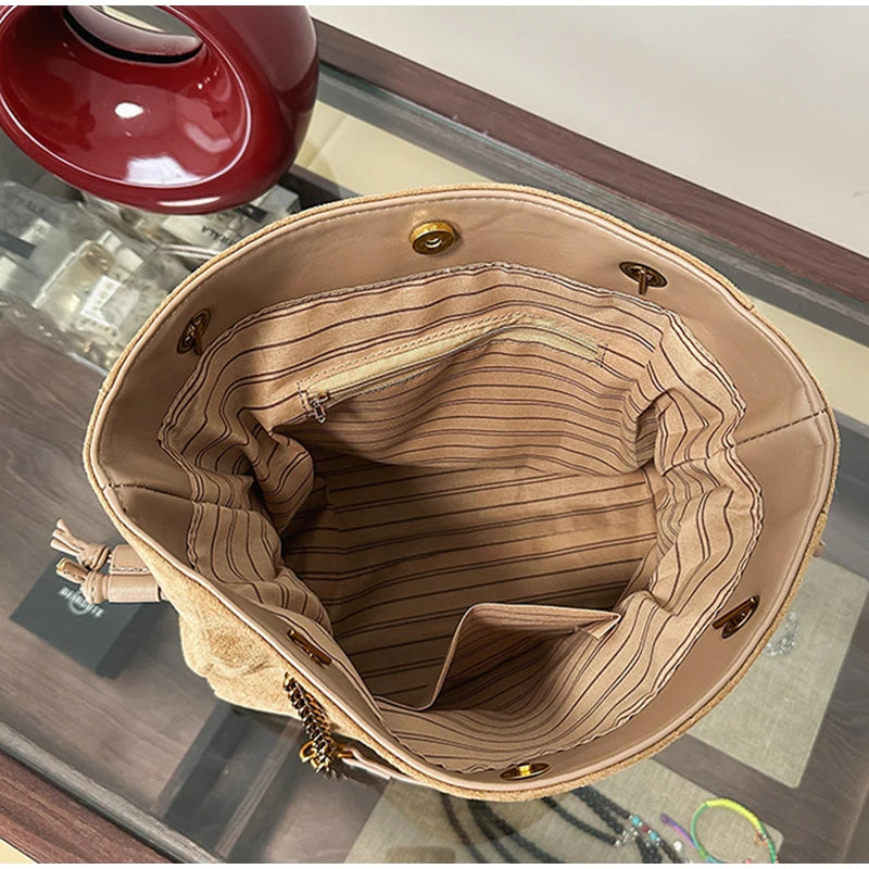 Crafted from premium suede fabric with a delicate and soft touch, paired with a distressed metal chain and 3D diamond-quilted stitching, it perfectly blends vintage charm with modern style. The unique drawstring design allows for flexible capacity, creating a relaxed and sophisticated feel.