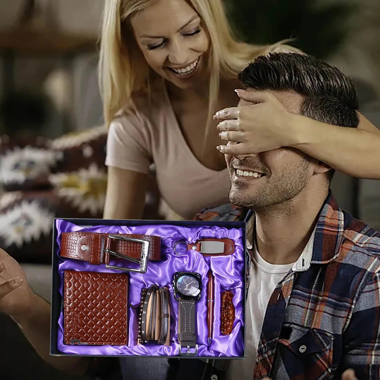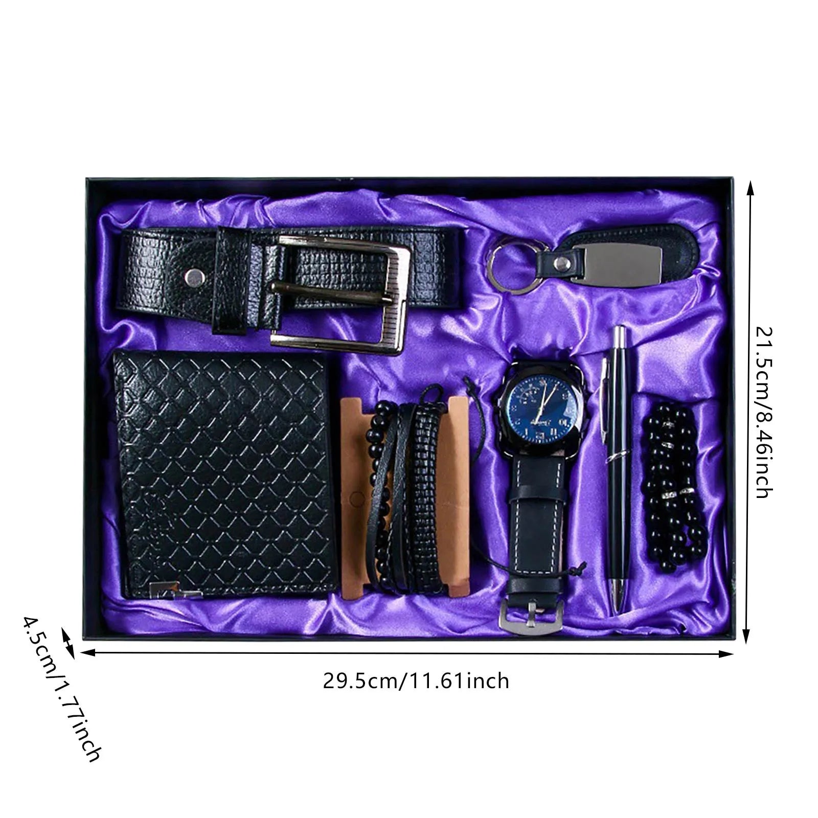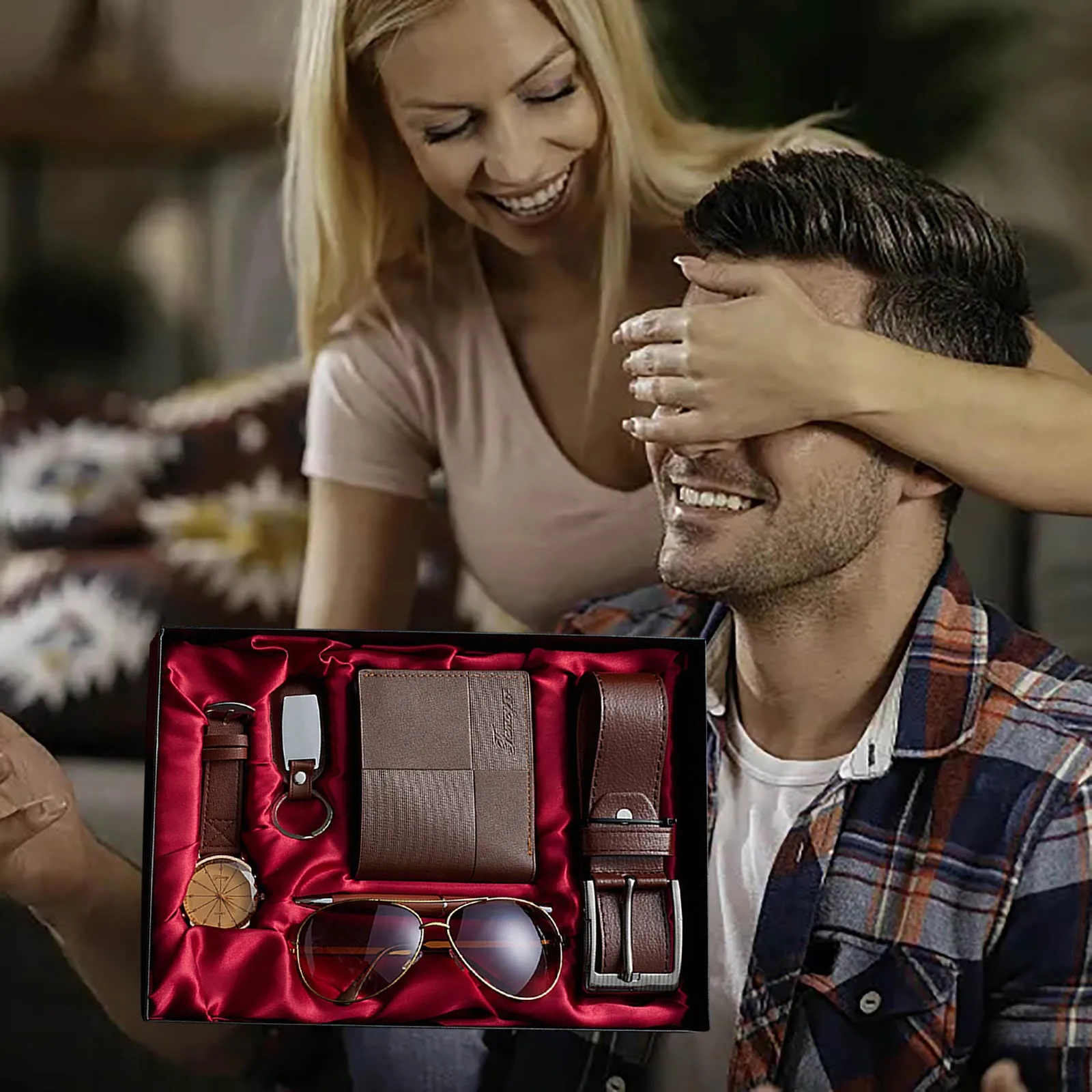 Luxury Gift Set for Him: the special man in your life with our exquisite gift set, featuring a premium leather quartz watch, stylish belt, keychain, sunglasses, wallet, and pen. Perfect for any occasion, whether it's Valentine's Day, Father's Day, or his birthday!