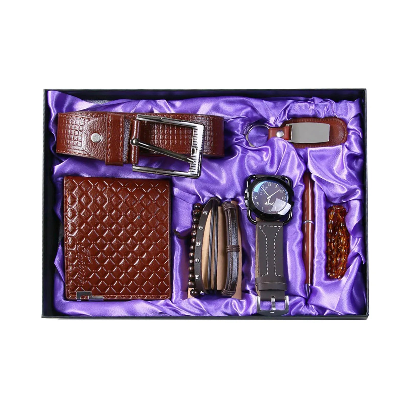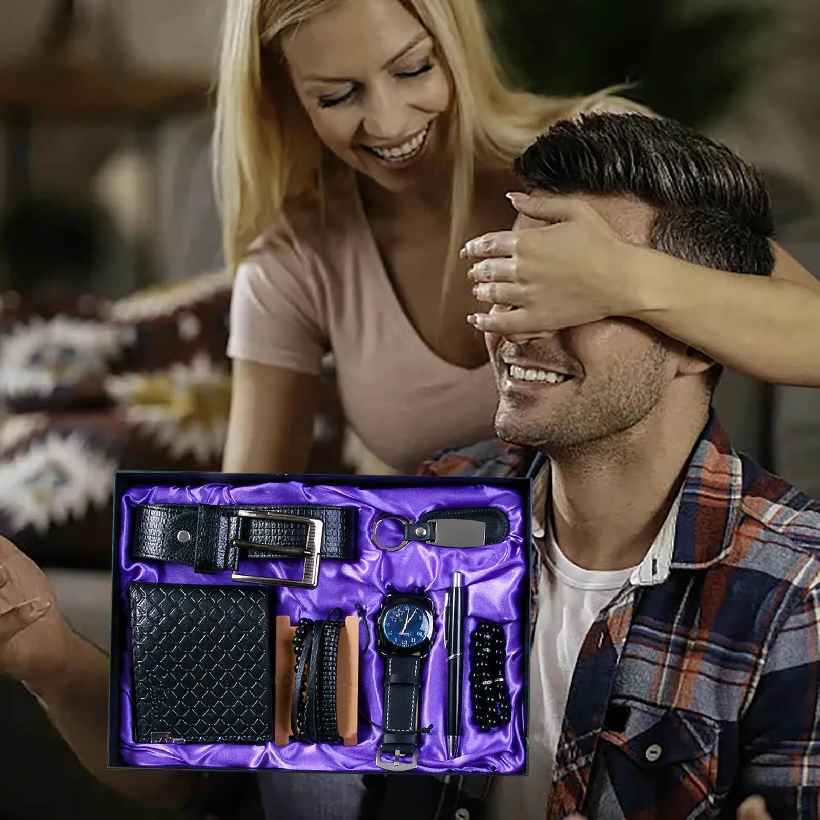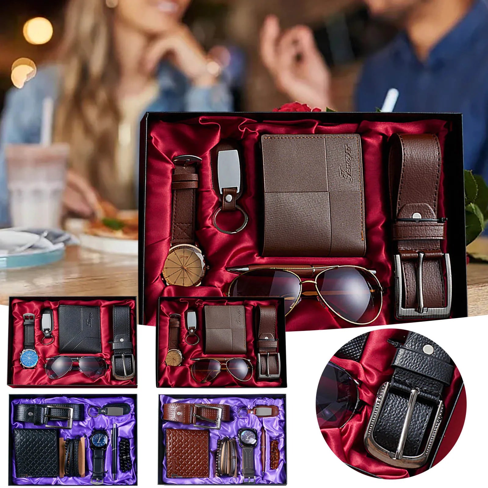 Luxury Gift Set for Him: the special man in your life with our exquisite gift set, featuring a premium leather quartz watch, stylish belt, keychain, sunglasses, wallet, and pen. Perfect for any occasion, whether it's Valentine's Day, Father's Day, or his birthday!