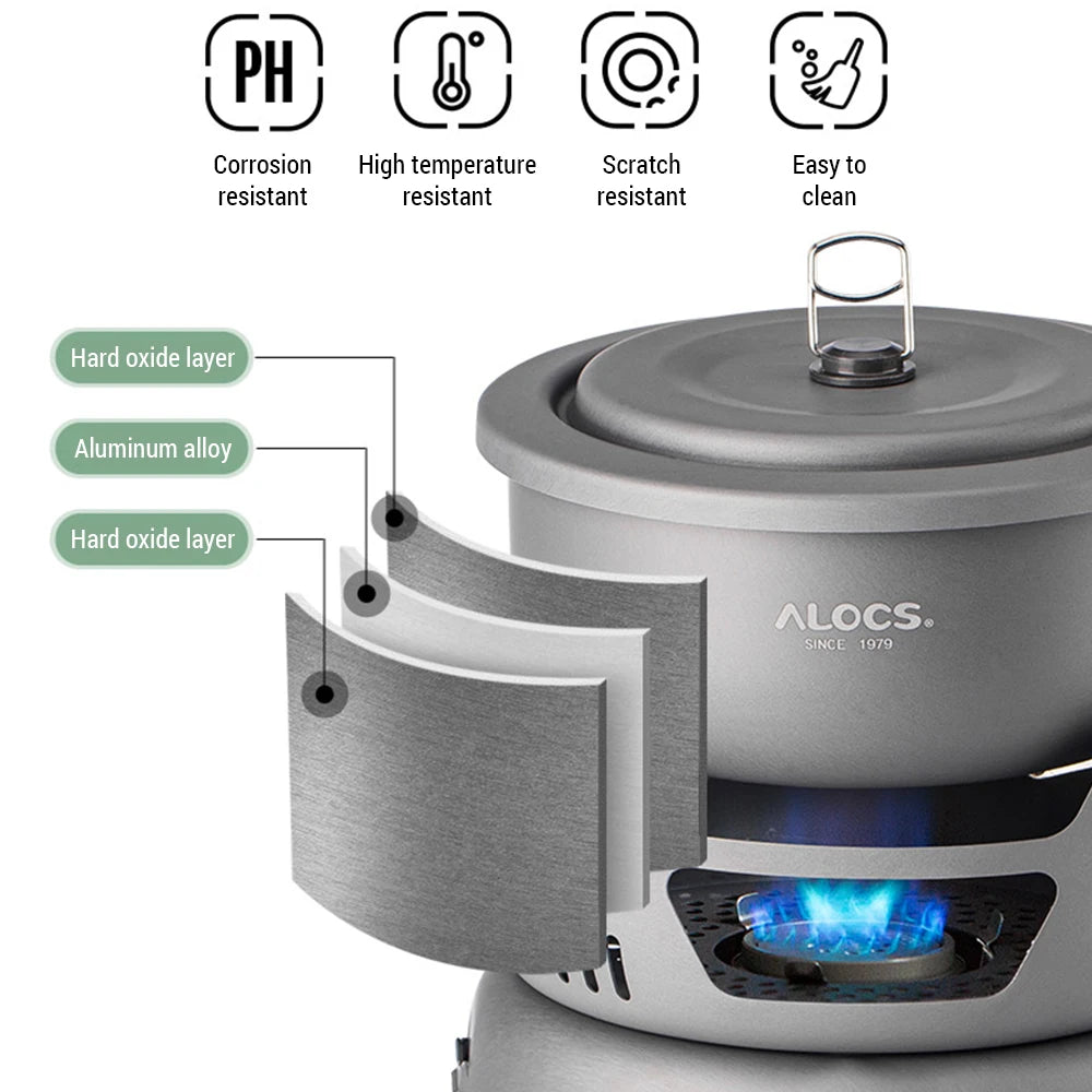 This camping cookware is made of ultra-light hard alumina, stainless steel and copper material, which is high temperature resistant, scratch resistance and oxidation resistance.