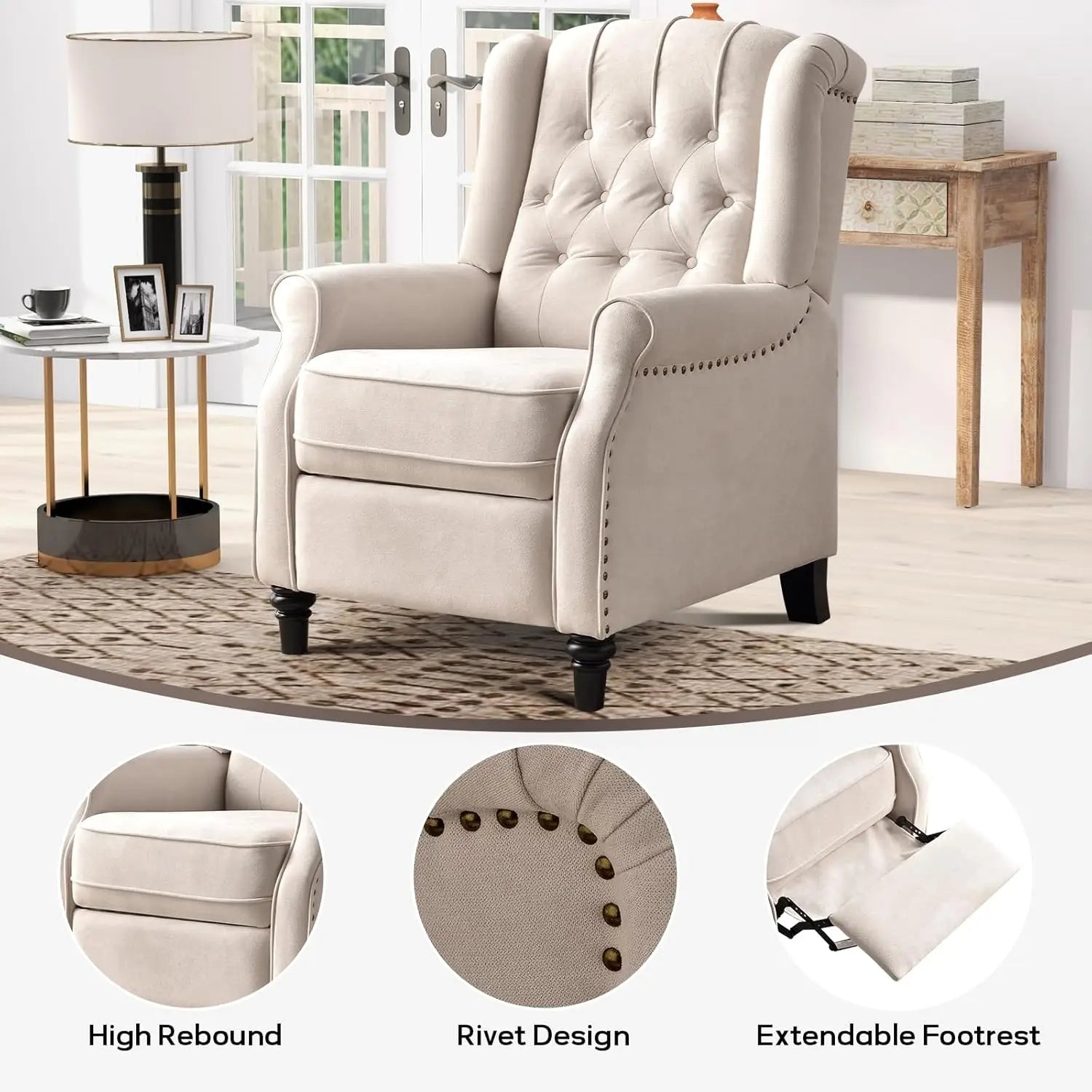 Elegant Mid Century Modern Design: Designed with your comfort in mind, this recliner features a high-density sponge cushion that provides excellent elasticity and support. The tall wingback offers spinal support, while the padded armrests enhance the luxurious feel. The classic rivet accents add a retro touch, making it an ideal choice for a push back recliner for living rooms, bedrooms or any other space.