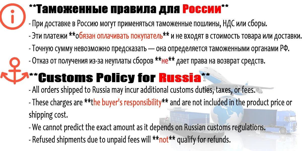 Внимание: Таможенные платежи в России оплачиваются покупателем.