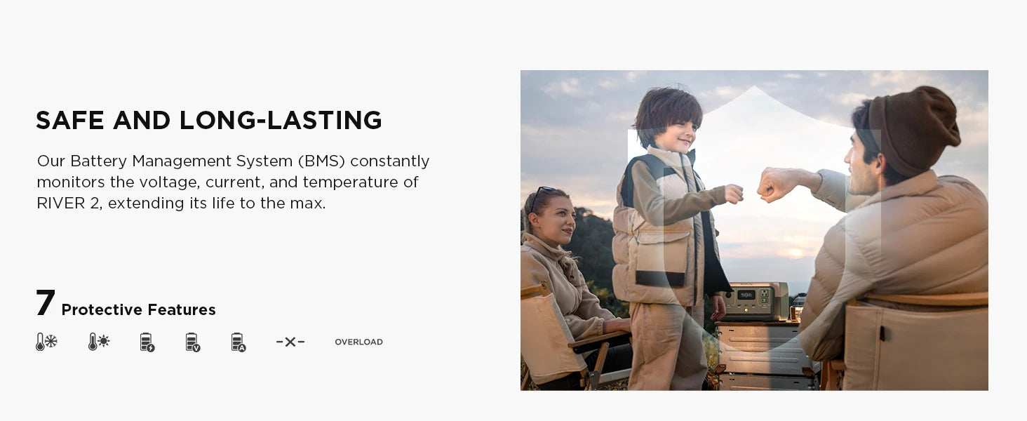 [LFP Long-Life Battery] - Using LFP battery cells, use and recharge RIVER 2 more than 3000 times before hitting 80%. That's almost 10 years of regular use. RIVER 2 includes advanced BMS protection, monitoring voltage, current, and temperature to keep your LFP battery running for years.