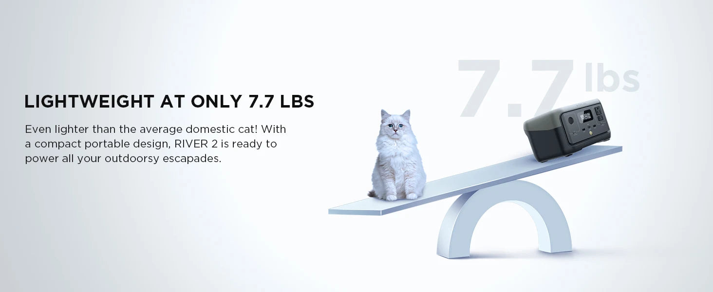 [Light & Portable] - With a lightweight of only 7.7 lbs, RIVER 2 is the ideal outdoor generator for all your off-grid adventures. With a built-in handle, this portable battery is easy and convenient to take anywhere you need power.