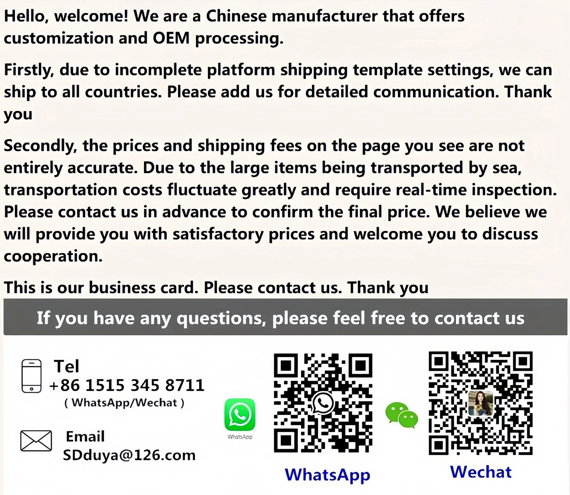 Secondly, the prices and shipping fees on the page you see are not entirely accurate. Due to the large items being transported by sea, transportation costs fluctuate greatly and require real-time inspection. Please contact us in advance to confirm the final price. We believe we will provide you with satisfactory prices and welcome you to discuss cooperation.