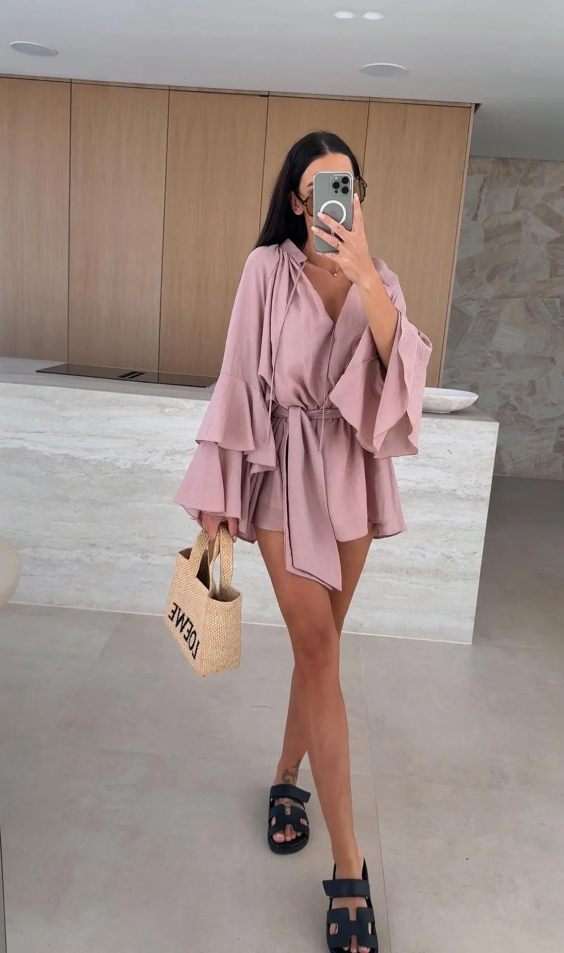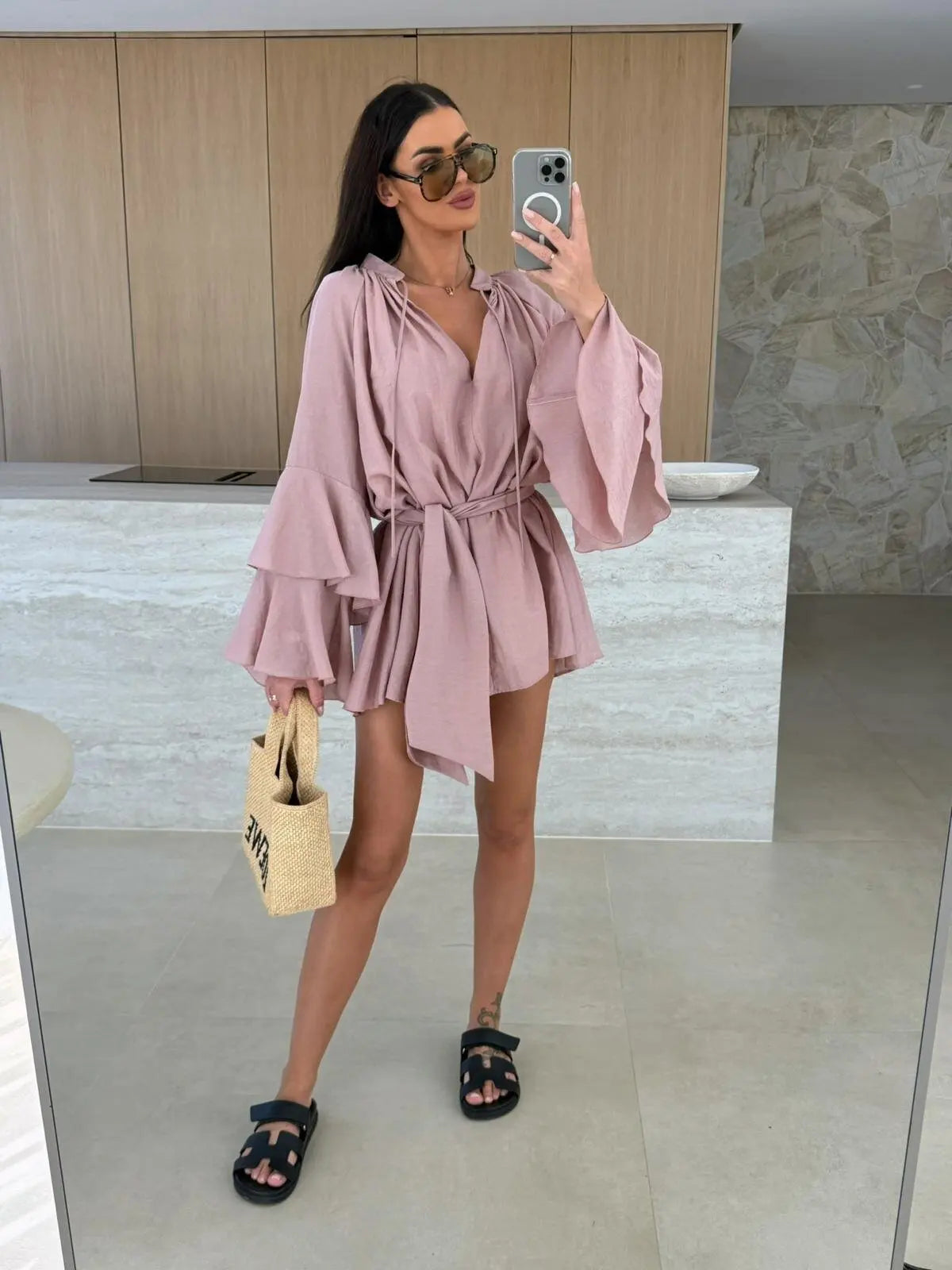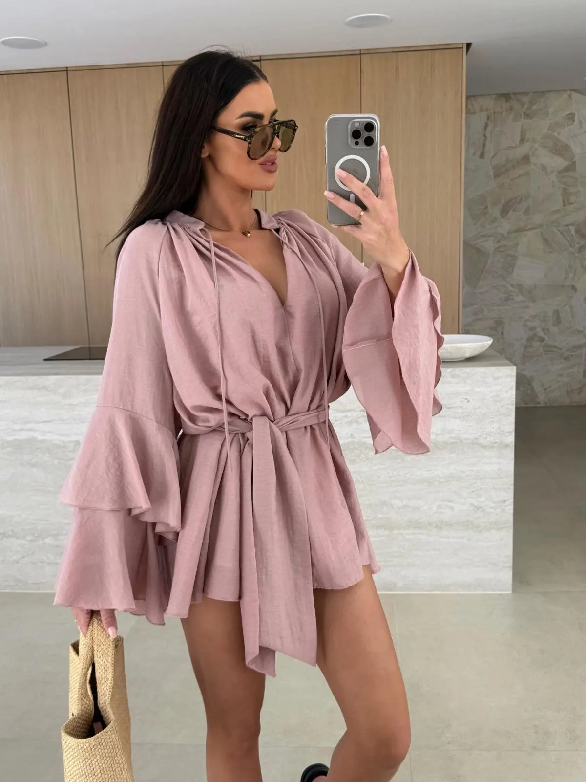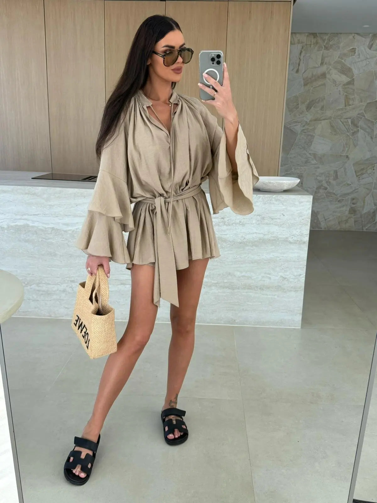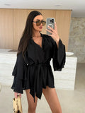 Elegant Fold Dress Women Brown Deep V-neck Long Sleeve Mini Dresses Female 2025 Spring Summer Fashion Loose Lady Vestidos