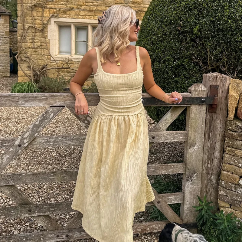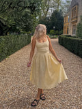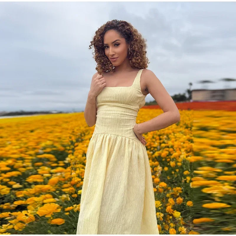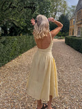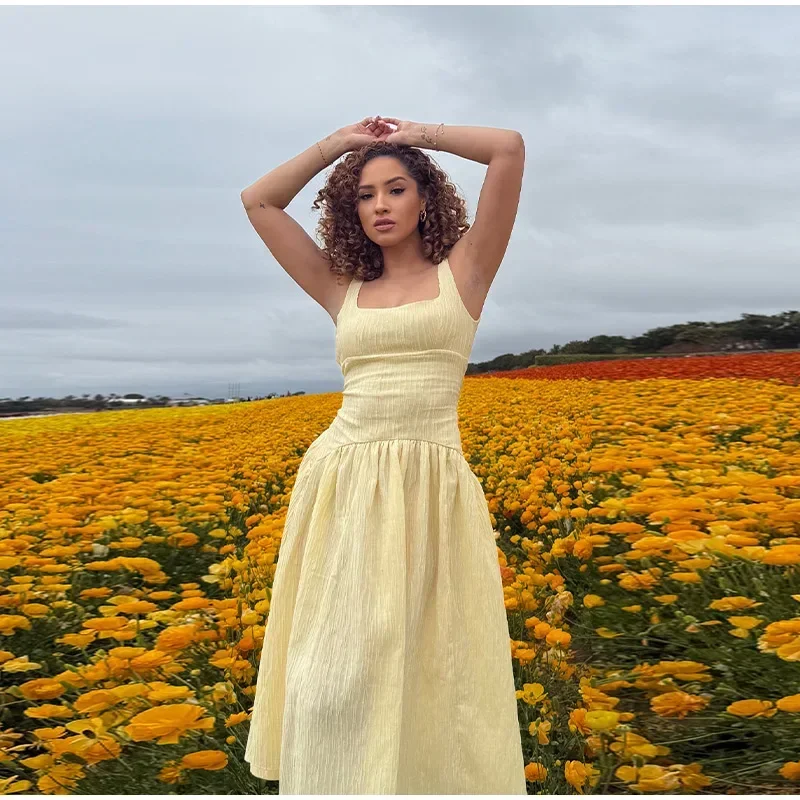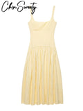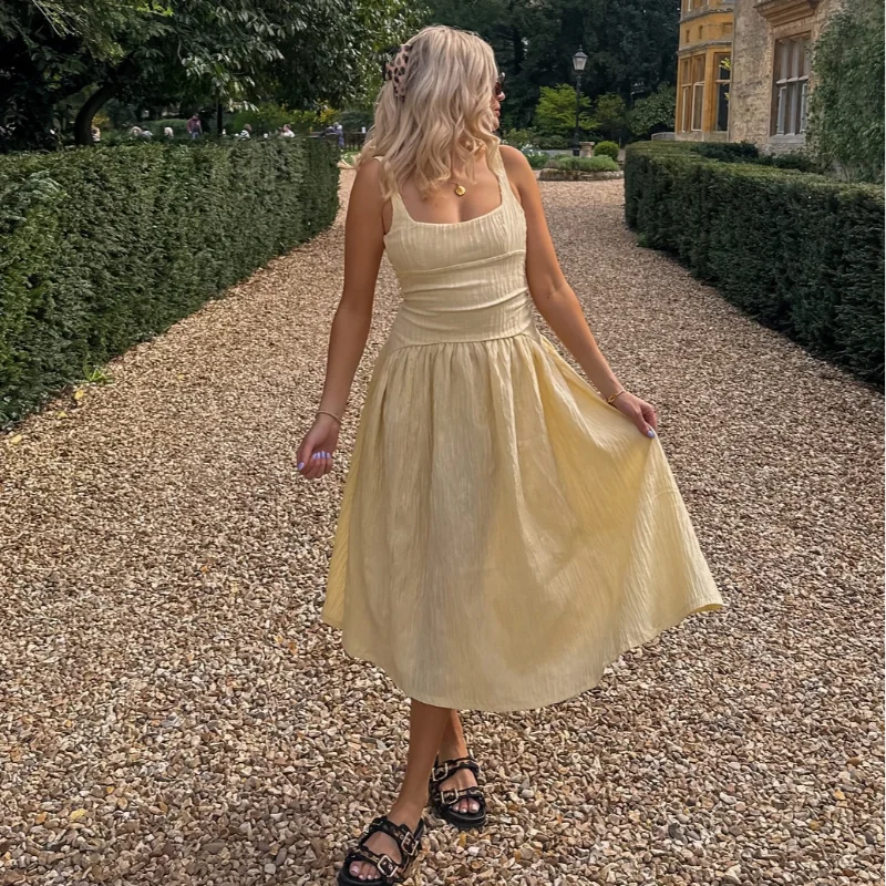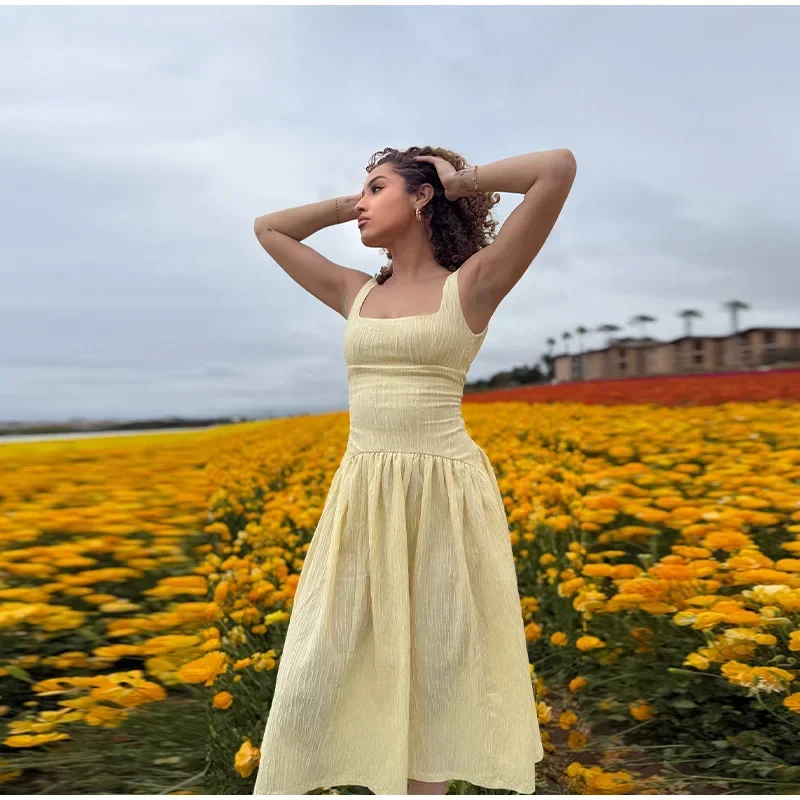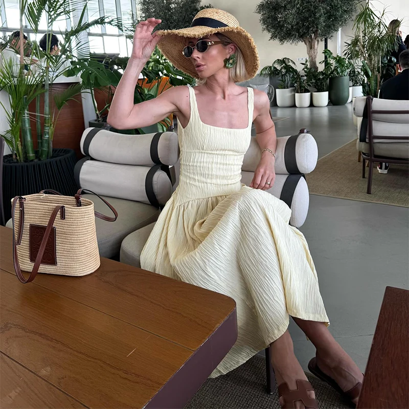 Elegant Pleated Long Dress Women Slim Square Neck Backless Sleeveless Female Sling Dresses 2025 Summer Lady Solid A-line Robe
