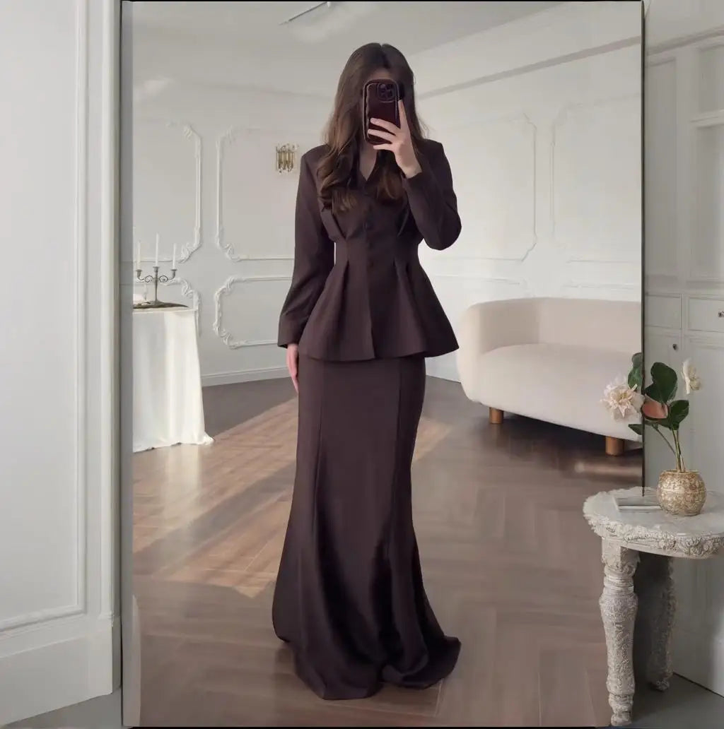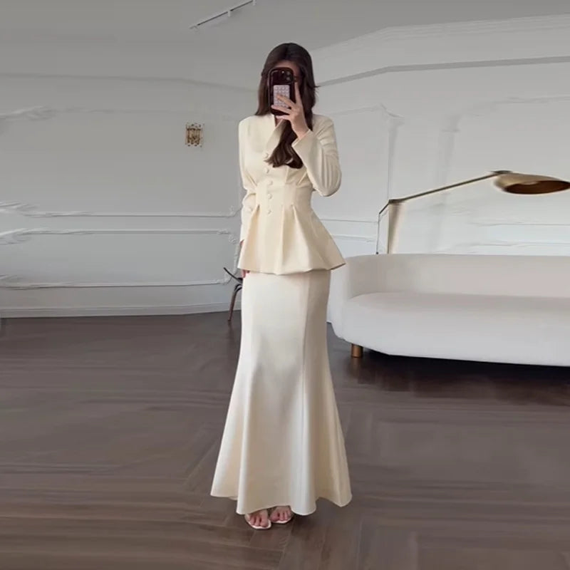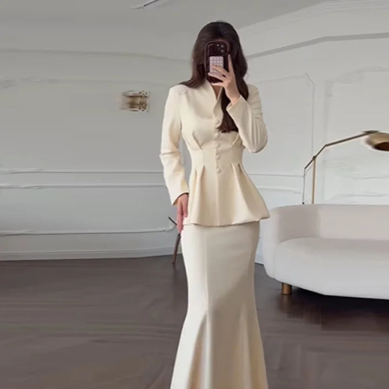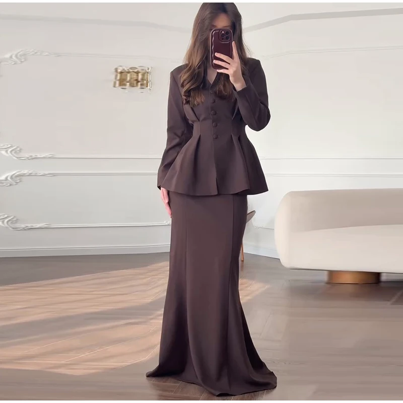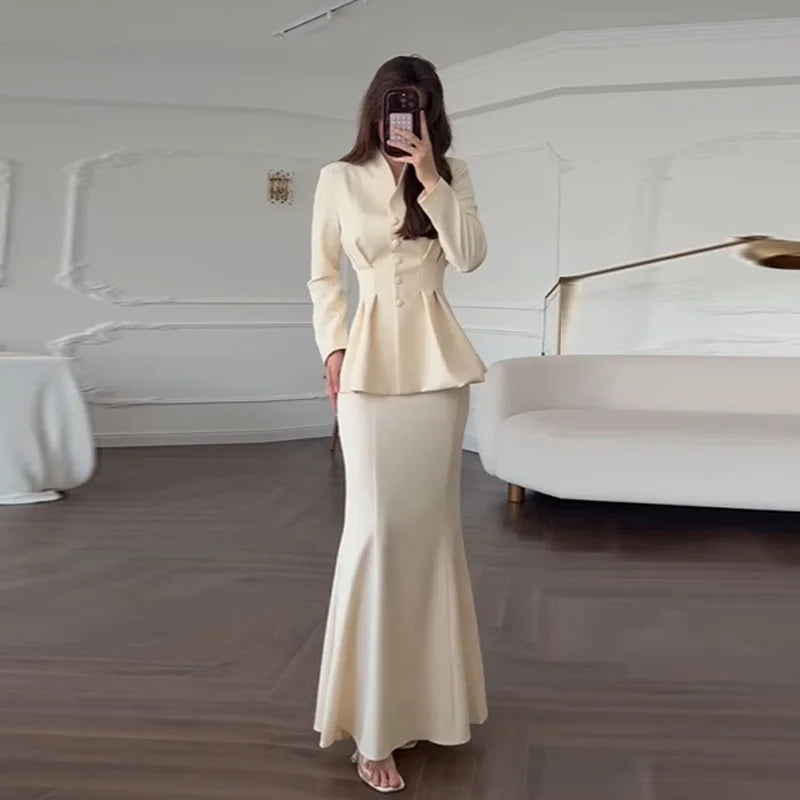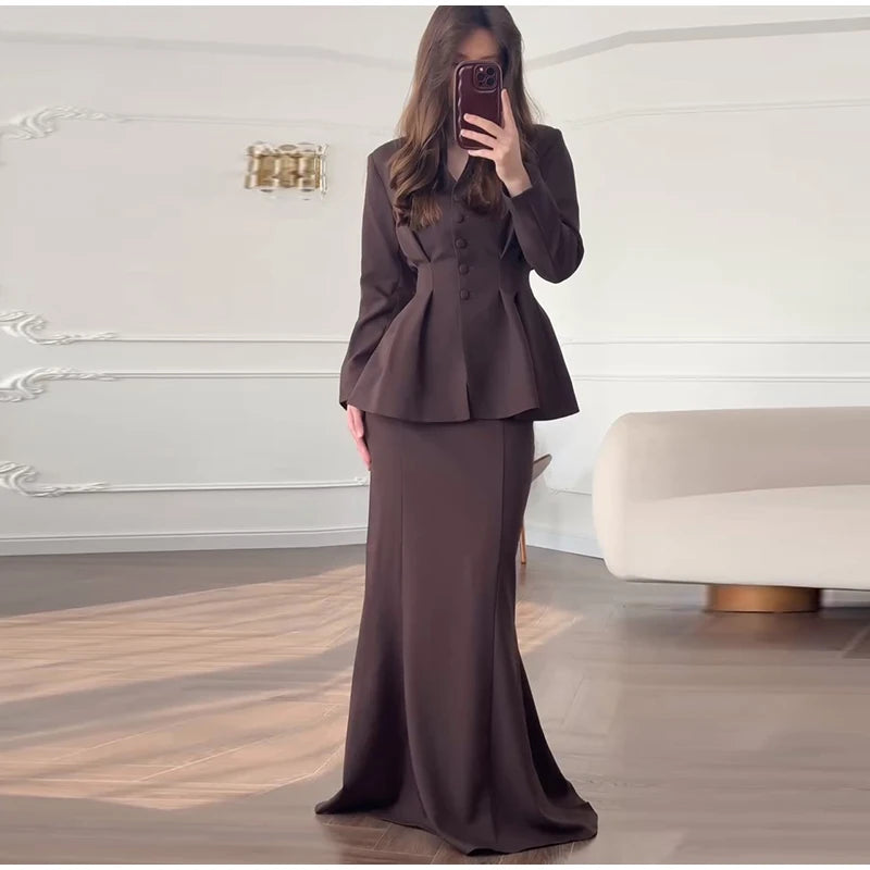 Elegant Single Breasted Shirt Long Skirt Set Women V-neck Long Sleeve Slim Fit Top Fishtail Skirts 2025 Autumn Commuter Outfit