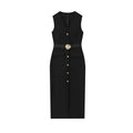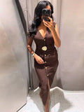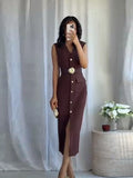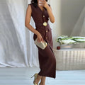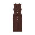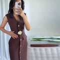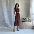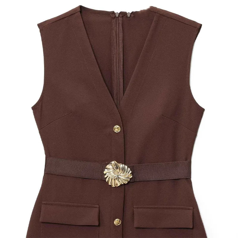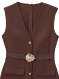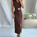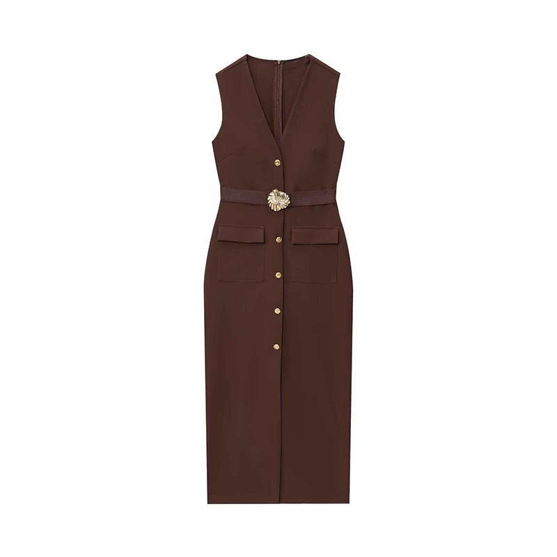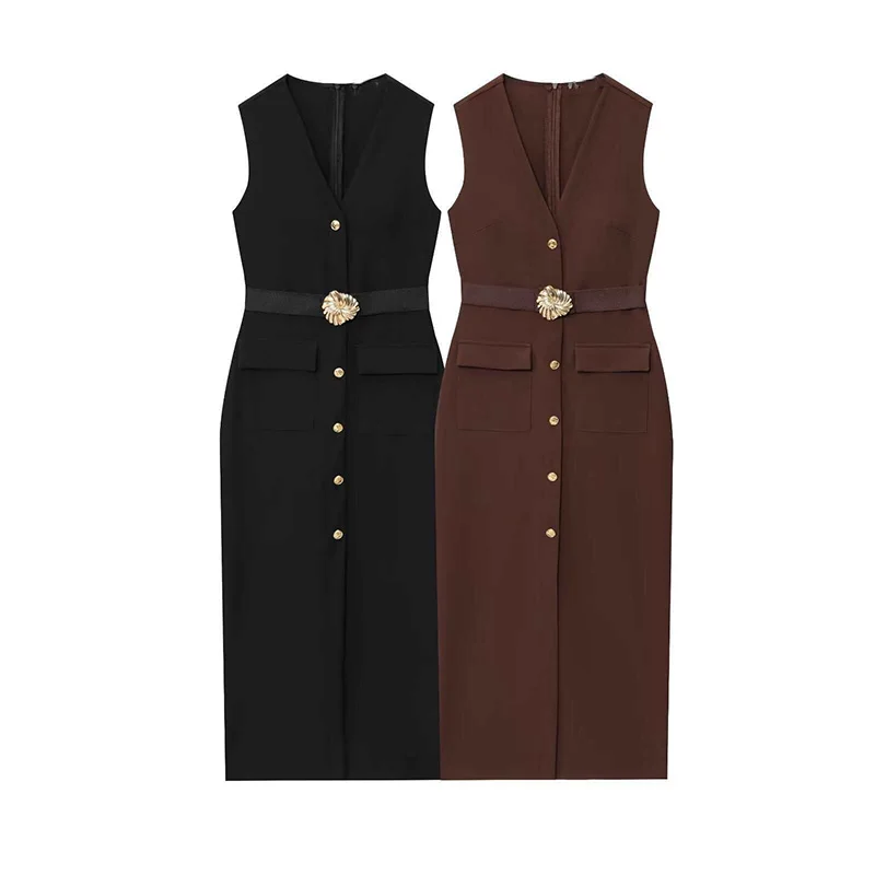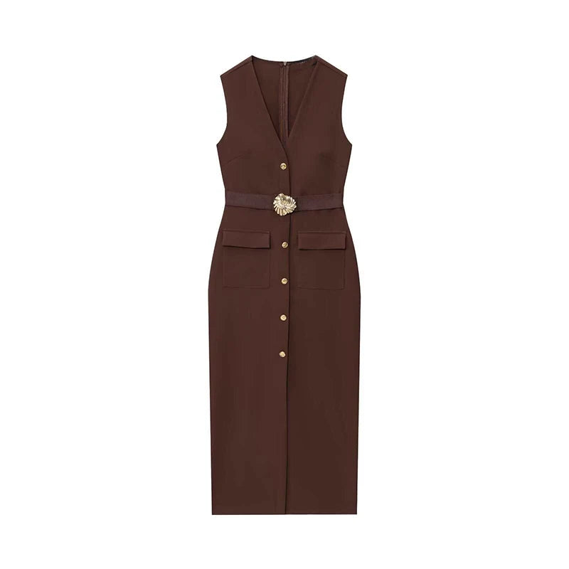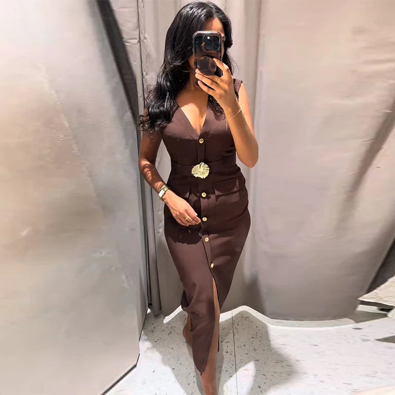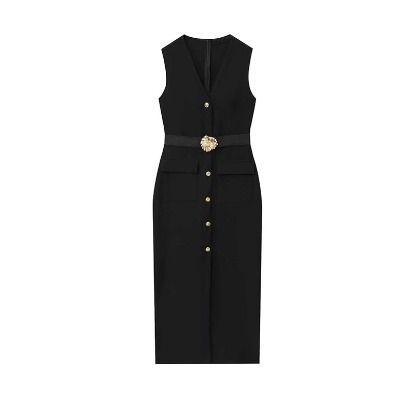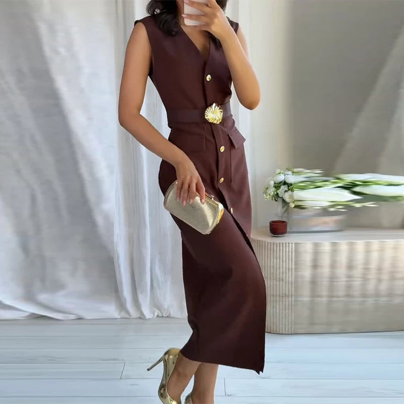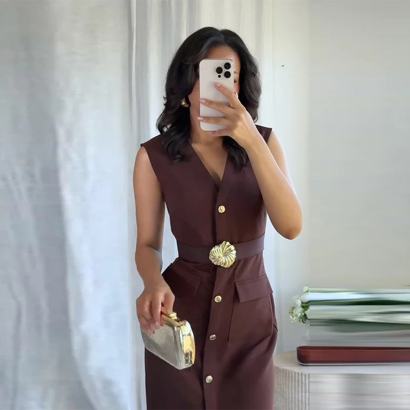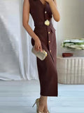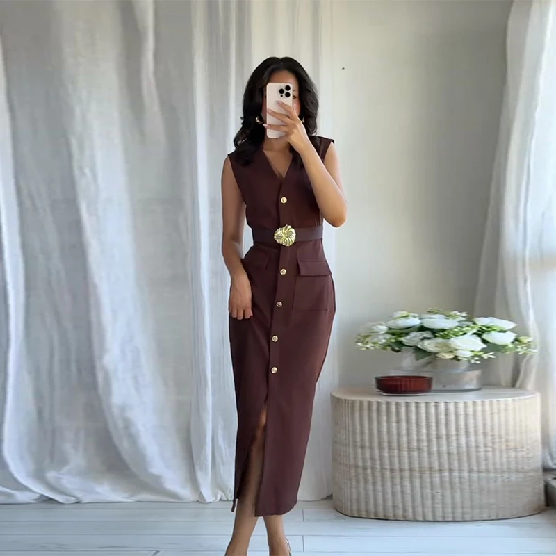 Elegant V Neck Single Breasted Midi Dresses for Women Chic Sleeveless Female Slim Dress with Belt 2025 Summer New OL Vestidos