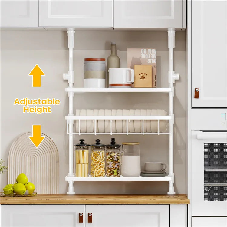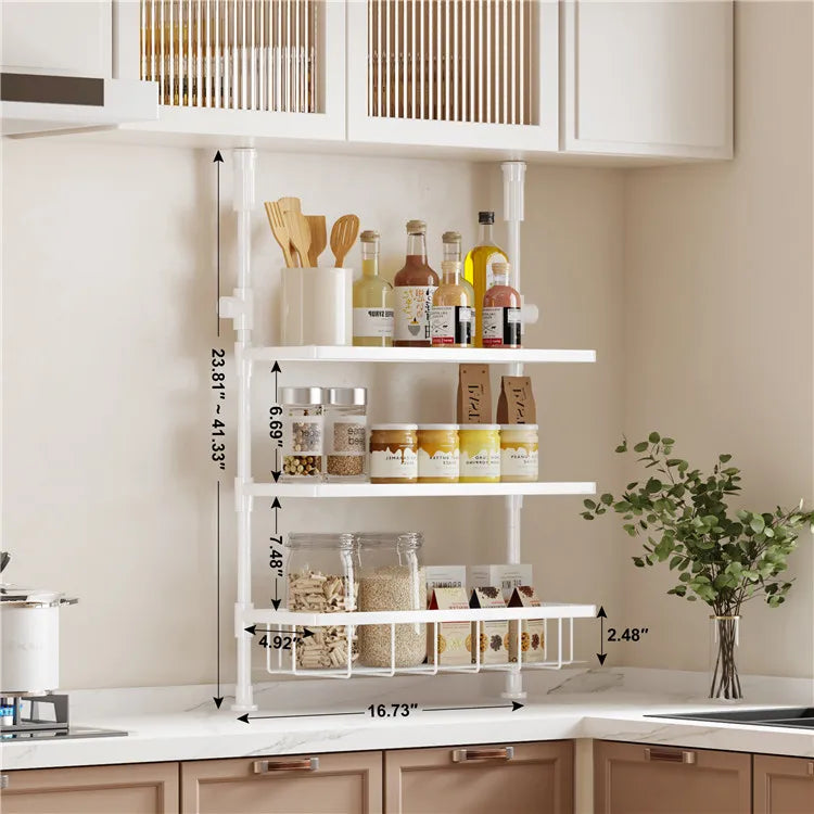 * Expandable countertop Organizer - The length of this countertop spice rack can be adjusted from 23.6" to 38.6" depending on how you want to arrange your space. Size:23.6 to 38.6 * 6.1* 16.93 inches, easy to assemble and detachable layered design. Shelf height, buckle and net position can be free adjusted. you can use the layer according to the space of the use scene, or according to your own needs and ideas.