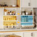 * Multifunctional Storage Shelves - Store all your kitchenware and take your spice jars, plates, utensils off the countertops and enjoy an ultra-tidy counter once more. The dish drying rack fits cleverly over the sink and therefore doesn't need a drain board. Any drops simply fall into the sink and not the countertop.