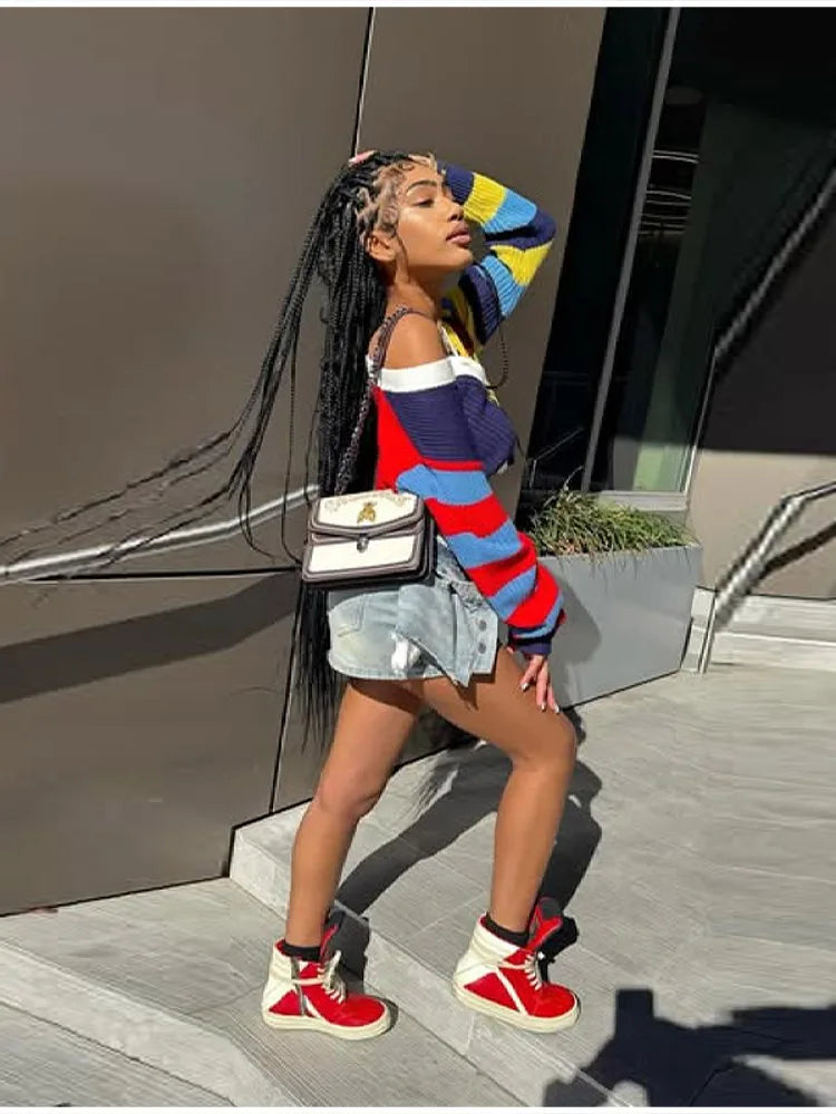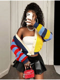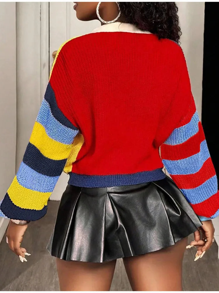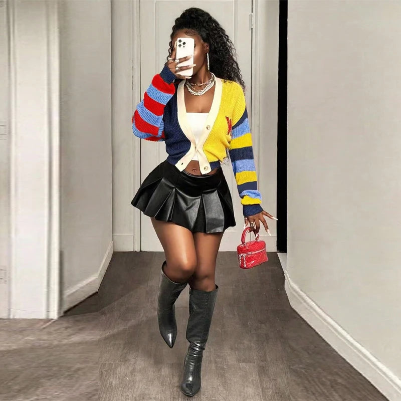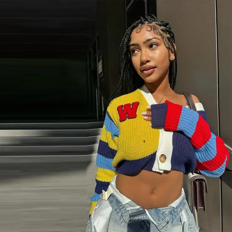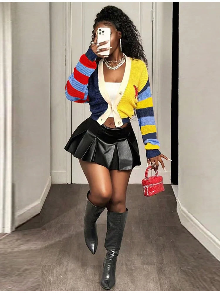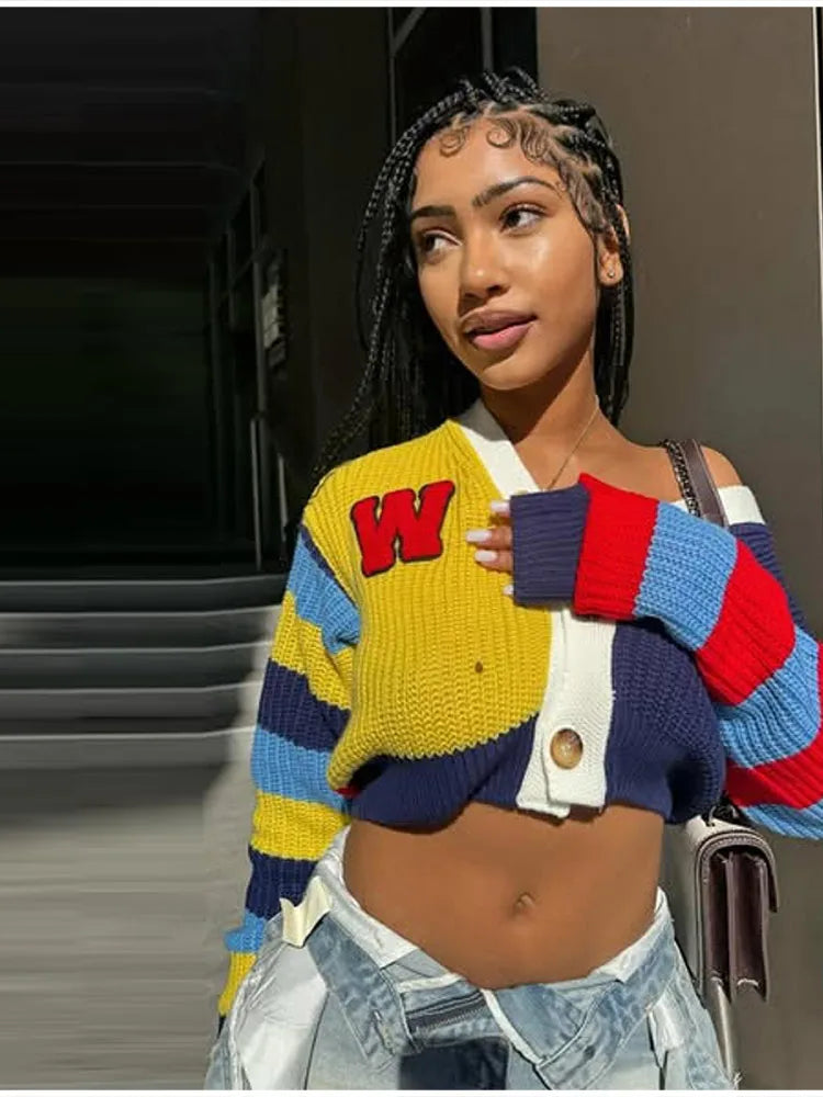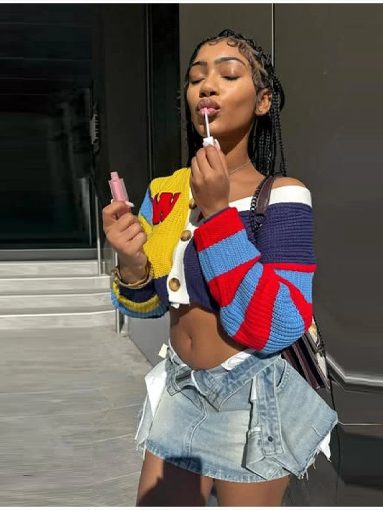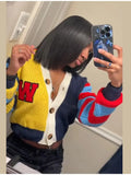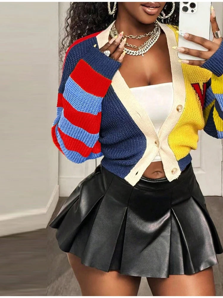 Fashion Colorful Letter Pattern Sweater Cardigan Women's Casual Full Sleeve Striped Button Coats 2025 Autumn New Style Knitwear
