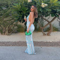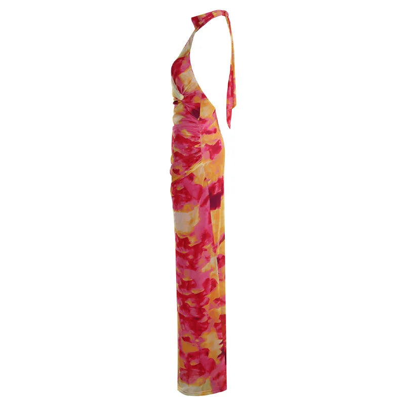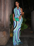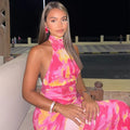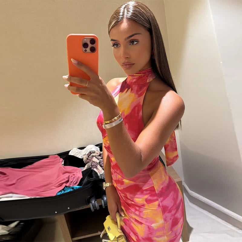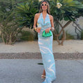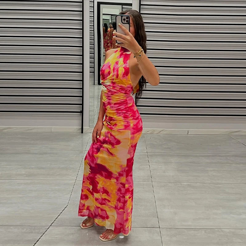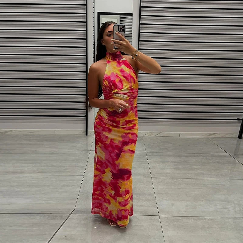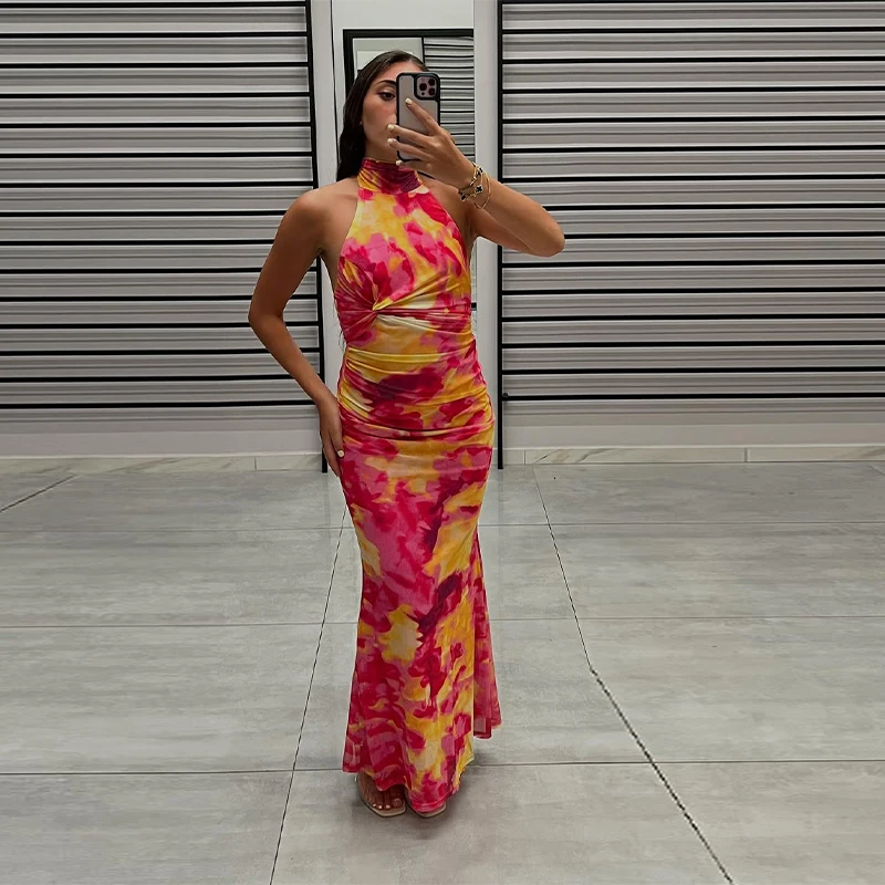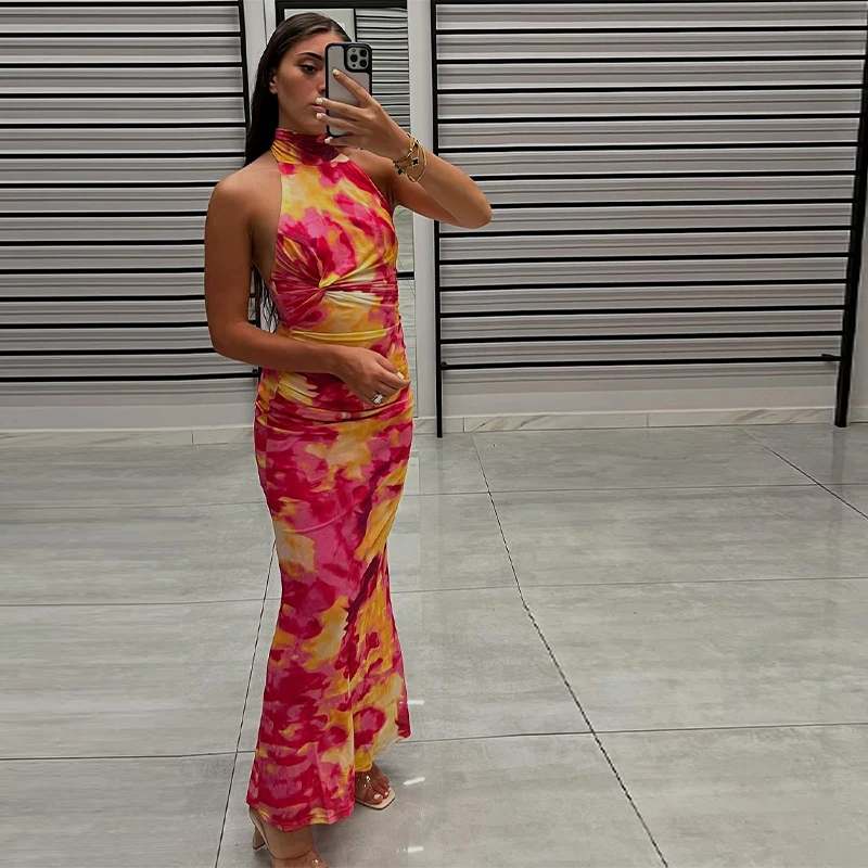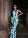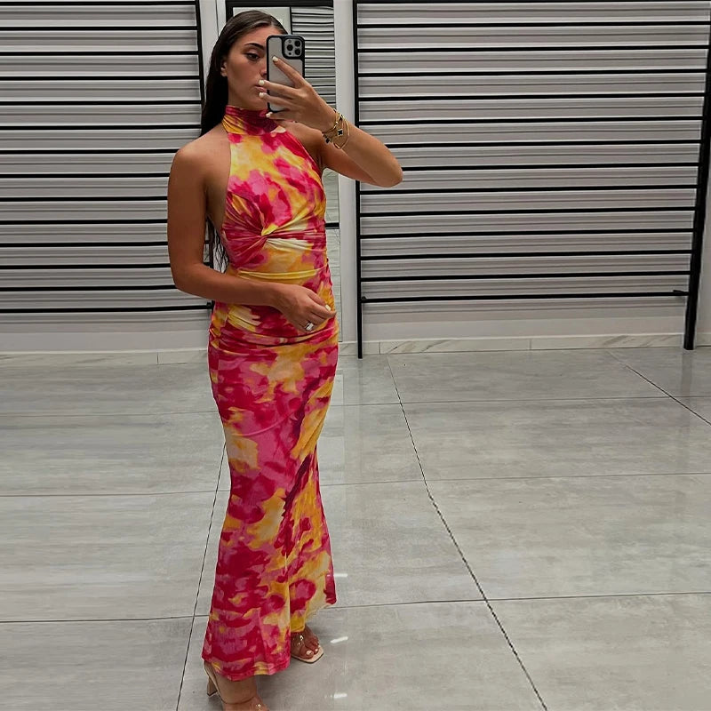 Fashion Printed Halter Long Dress for Women Elegant Sleeveless Backless Slim Bodycon Maxi Dresses Chic Summer Beach Party Robes