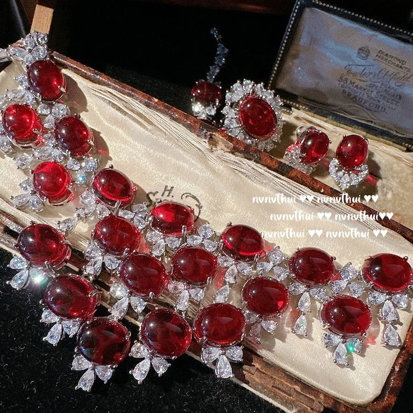 Fashion Women's S925 Silver Jewelry Set Geometric Lab Ruby Necklace Earrings Ring Bracelet Elegant Party Jewelry Wedding Jewelry