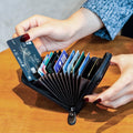 【Capacity】: 12 Secure Card Slots Fold Accordion Style (10 Individual Credit Card Slots & 2 Cash Slots) With 1 ID Card Slot.