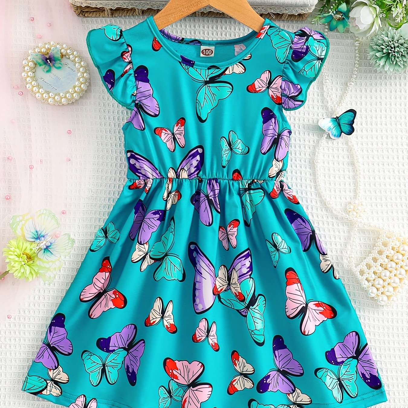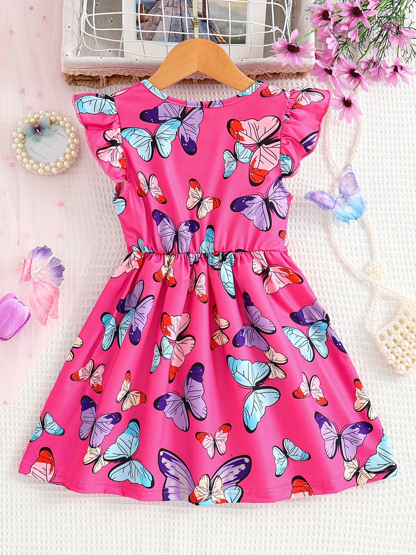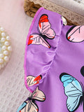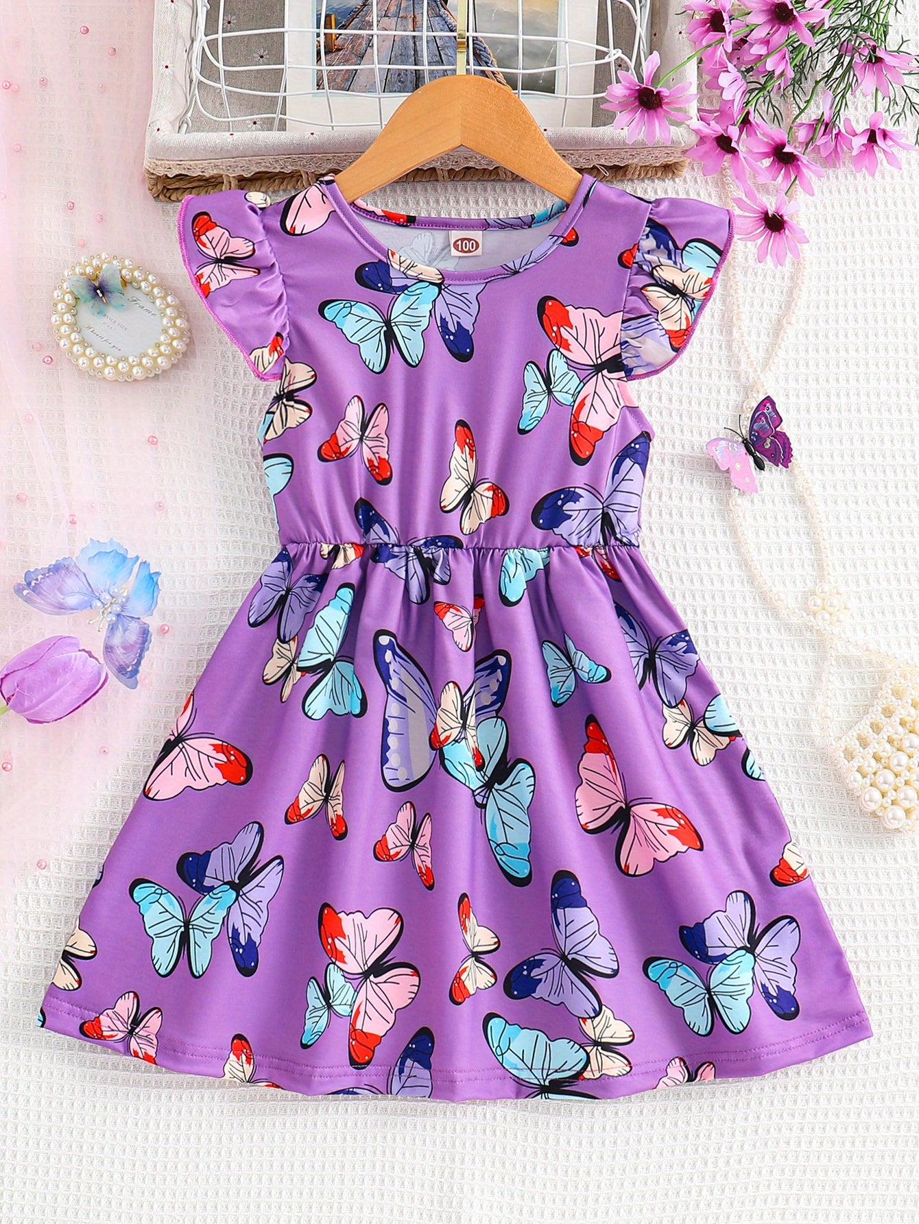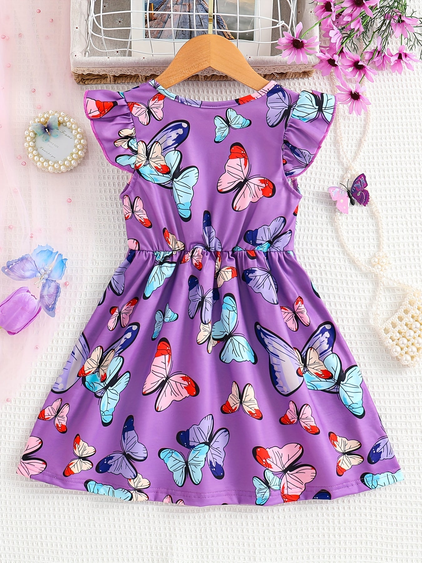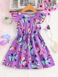 Girls' Sleeveless Butterfly Print Dress - Vibrant Purple Knee-Length Loose Fit with Ruffled Hem, Lightweight Summer Dress for Youngsters & Toddlers, Butterfly Print Dress, Youngsters'S Playwear, Playful Youngsters'S Fashion,