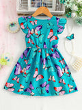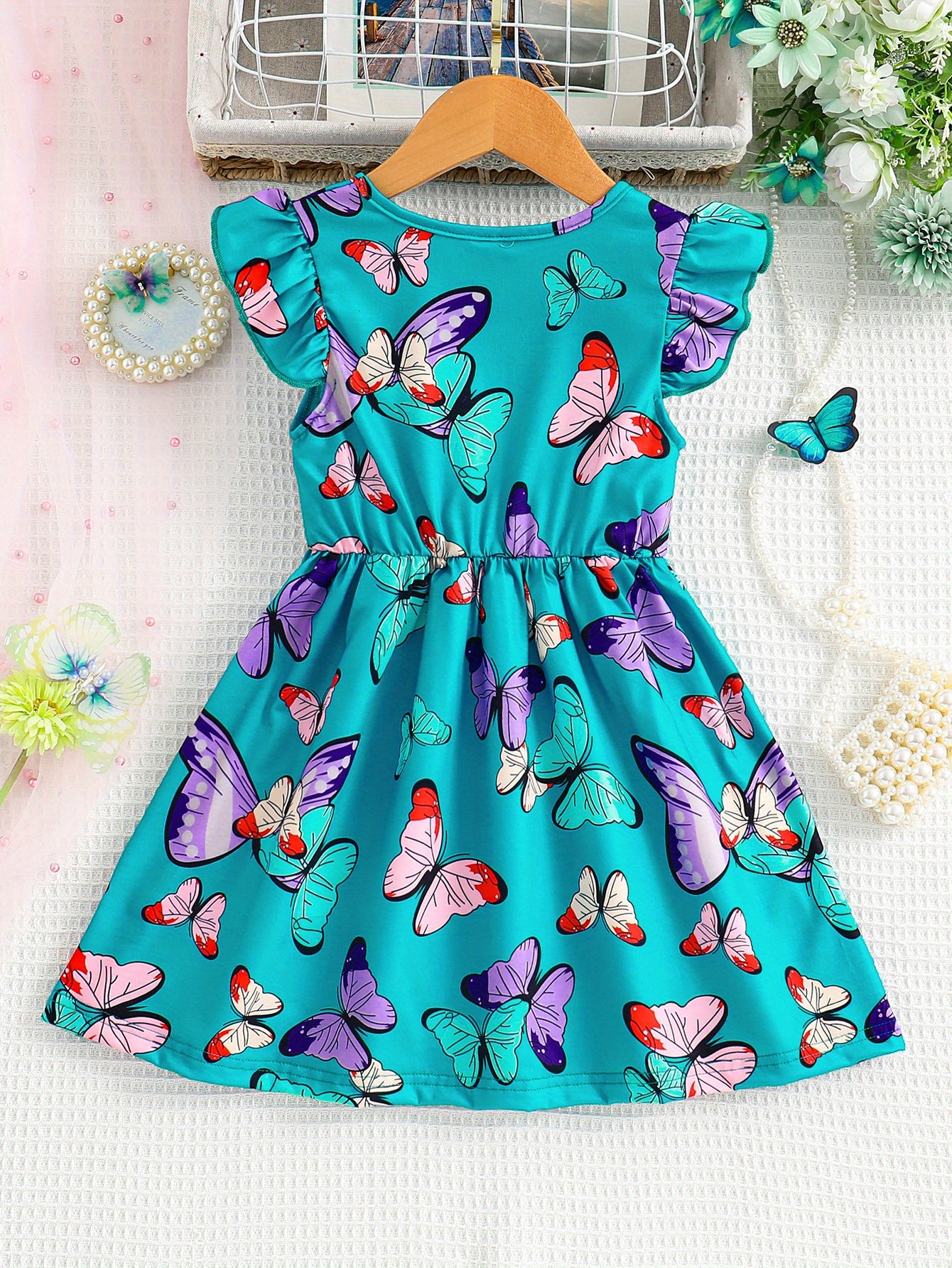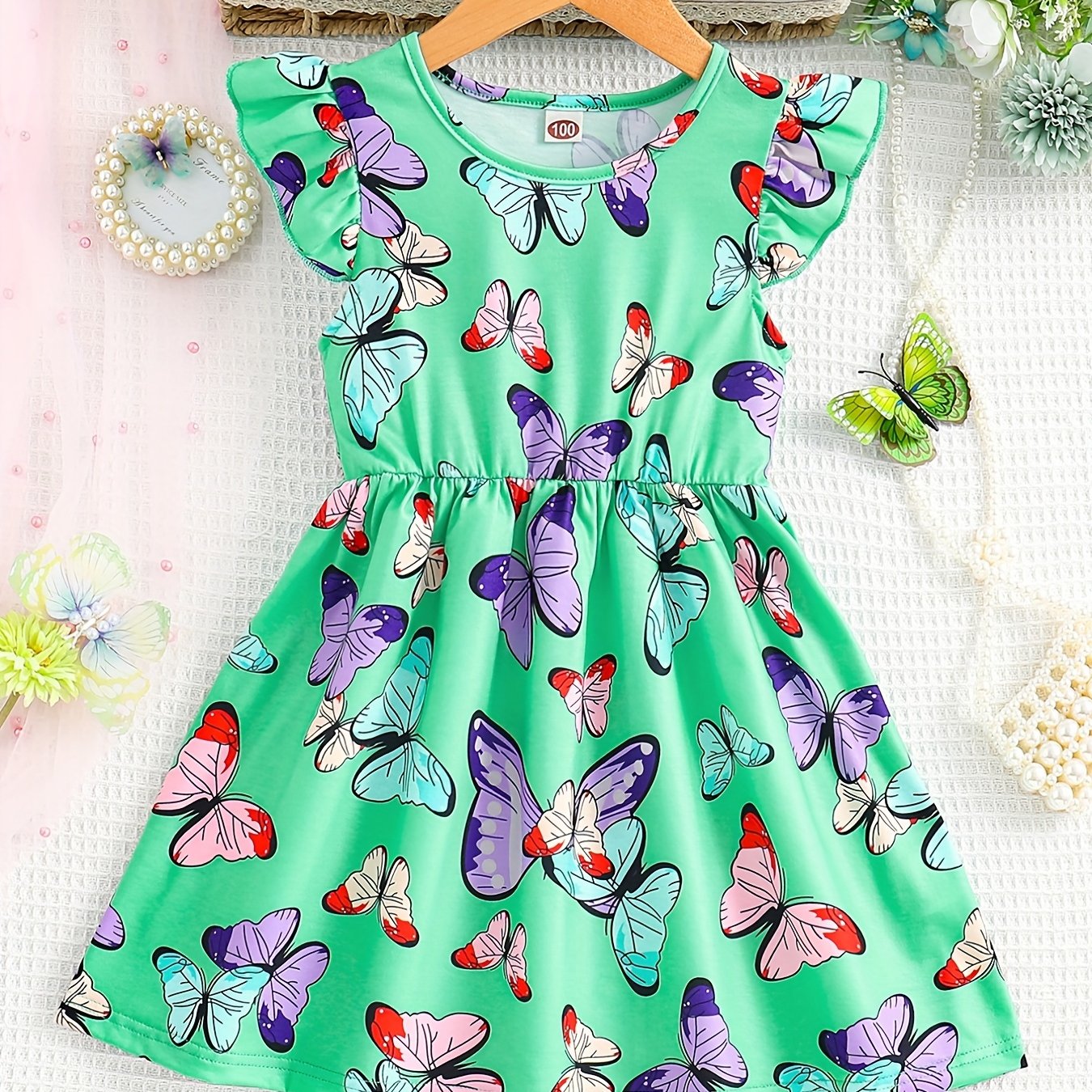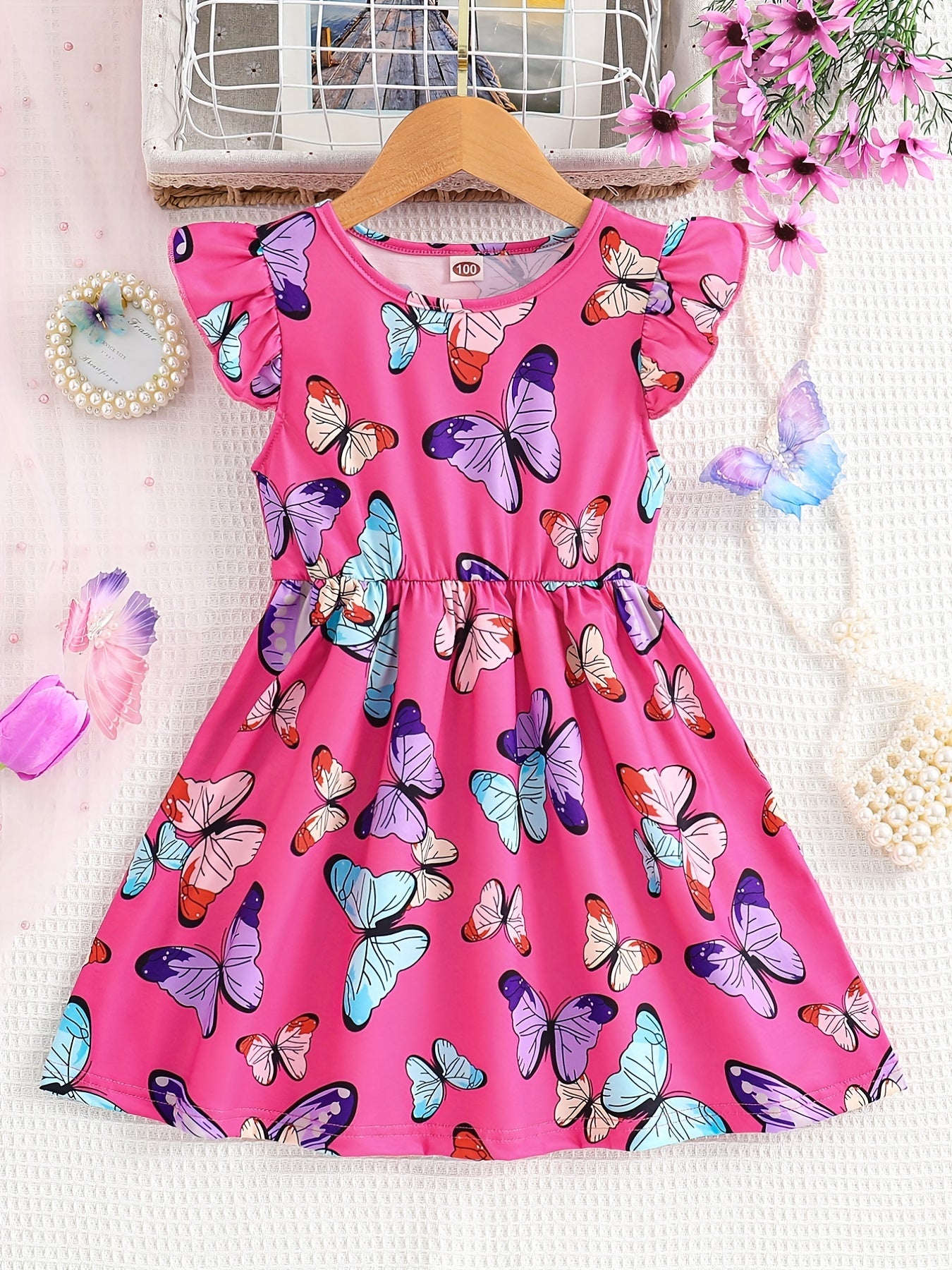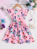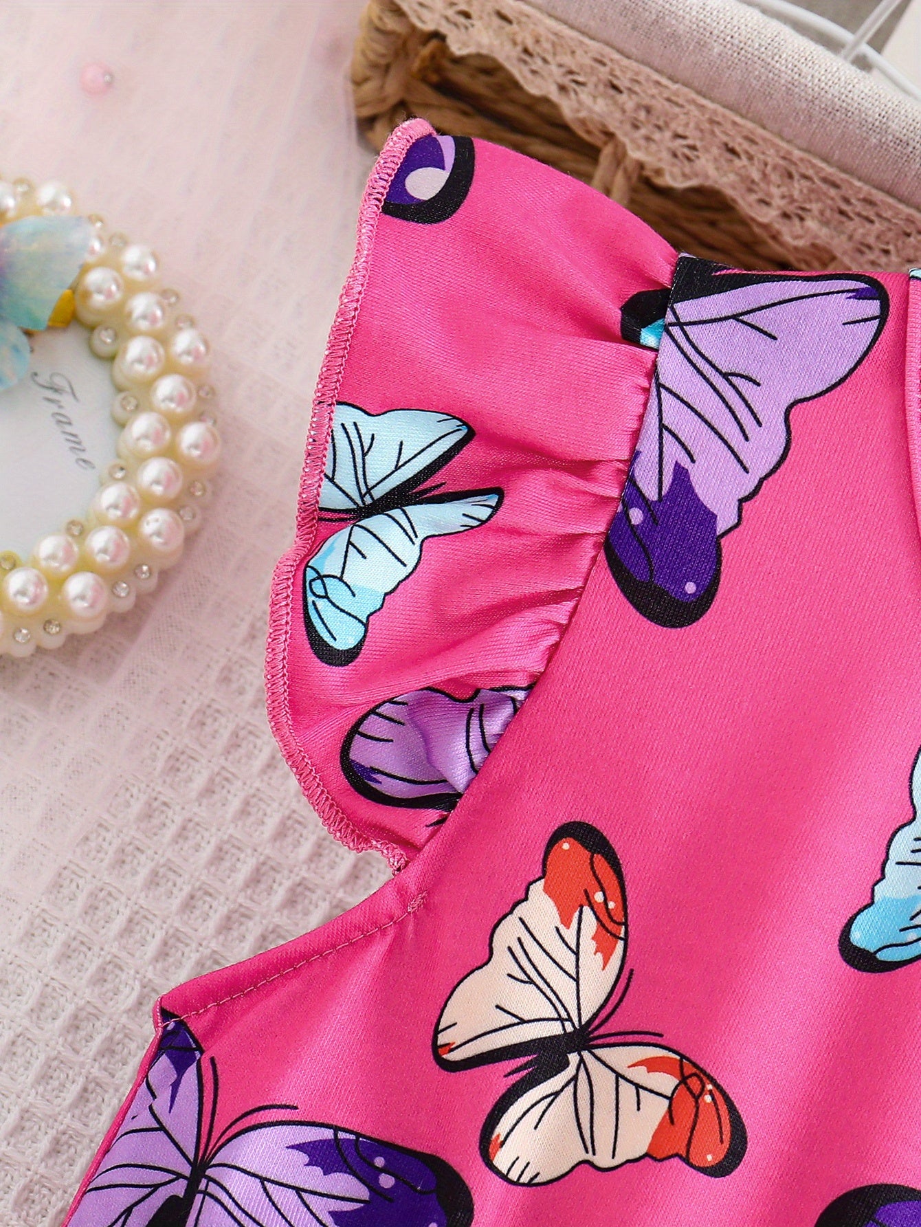 Girls' Sleeveless Butterfly Print Dress - Vibrant Purple Knee-Length Loose Fit with Ruffled Hem, Lightweight Summer Dress for Youngsters & Toddlers, Butterfly Print Dress, Youngsters'S Playwear, Playful Youngsters'S Fashion,