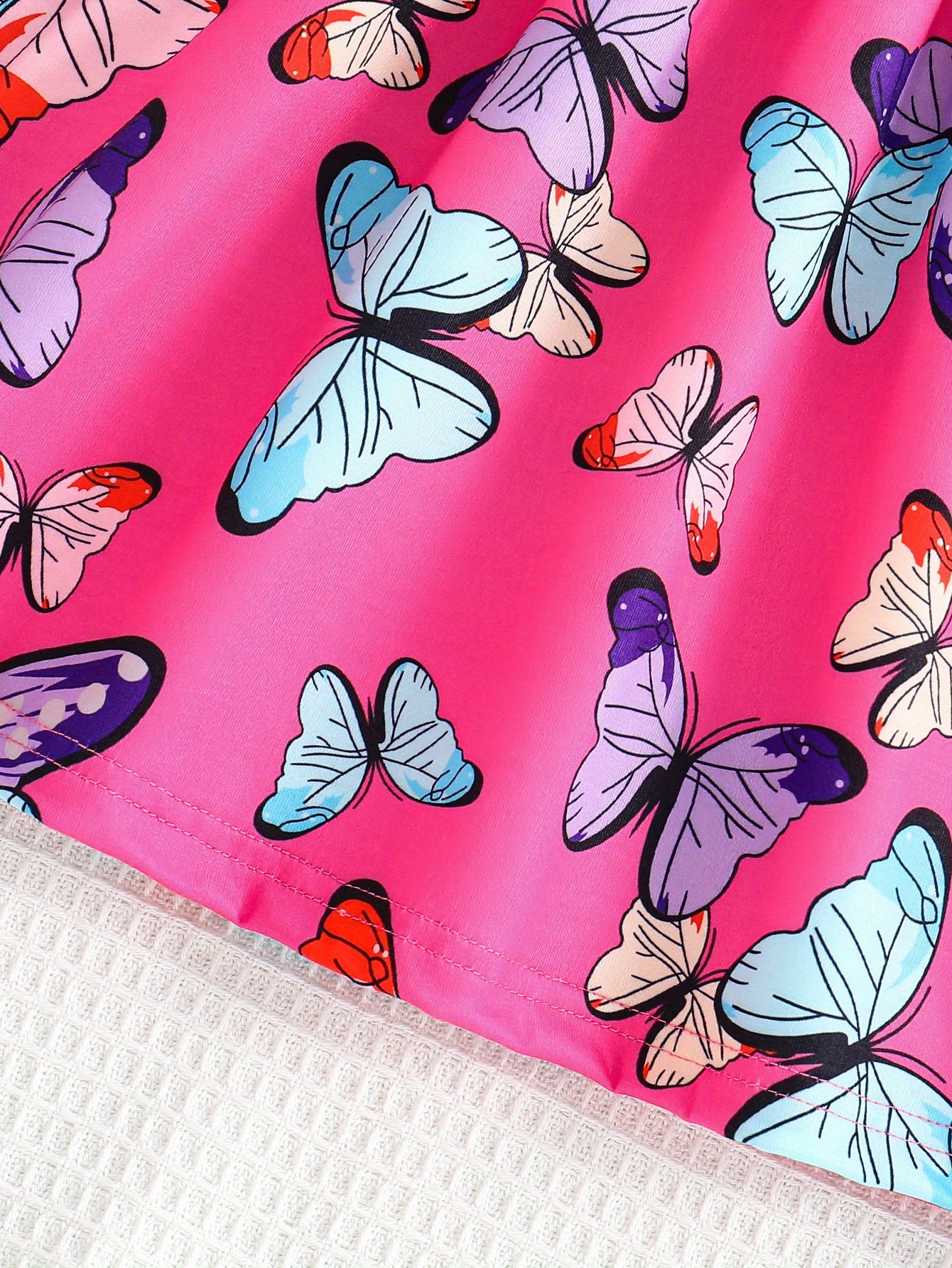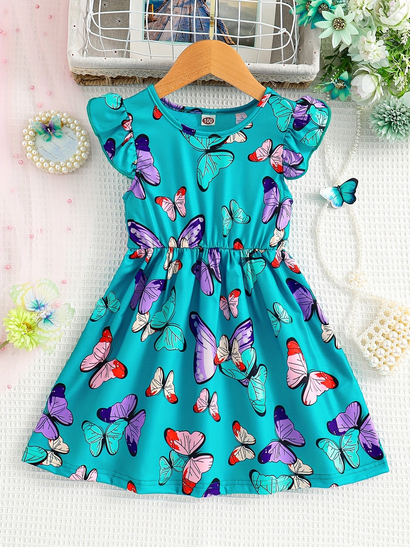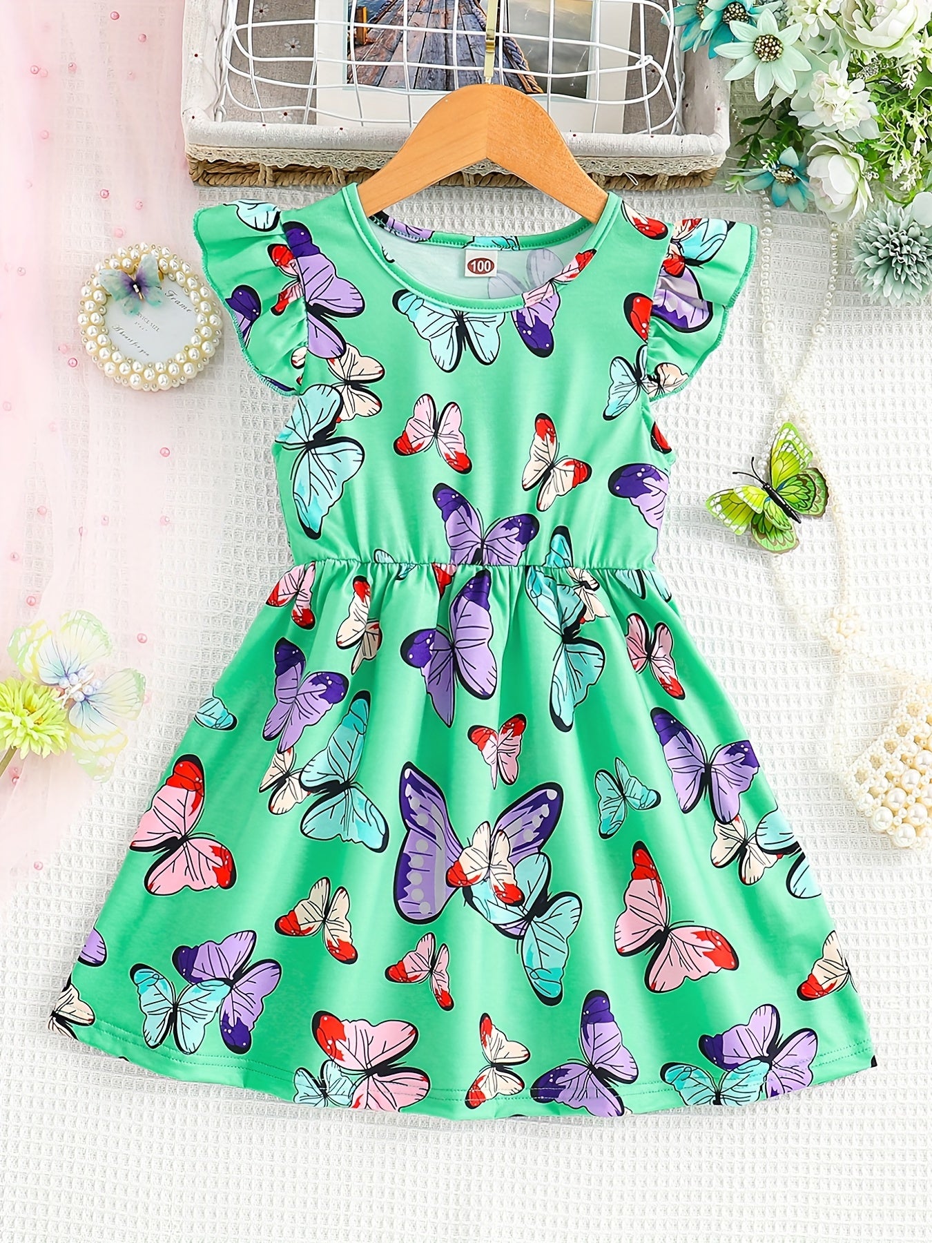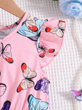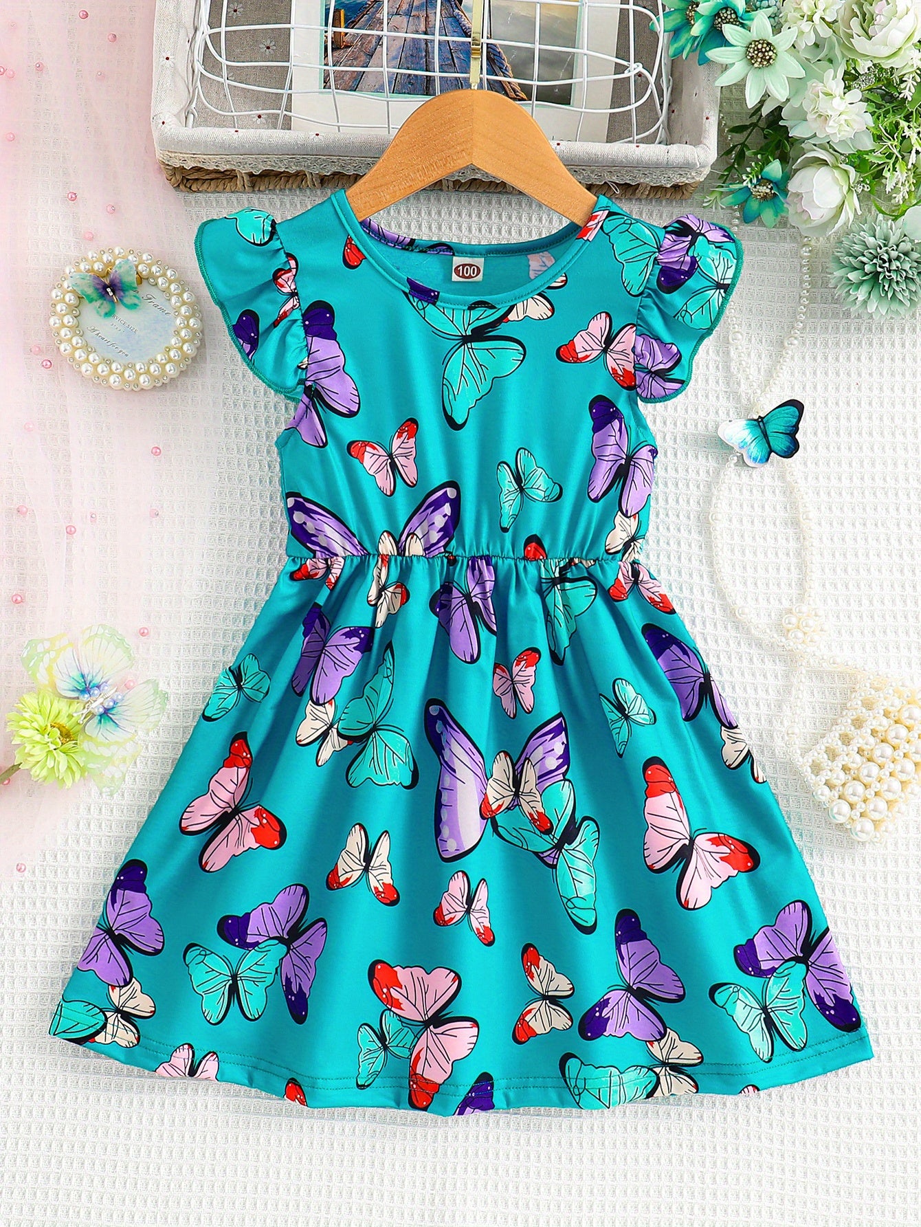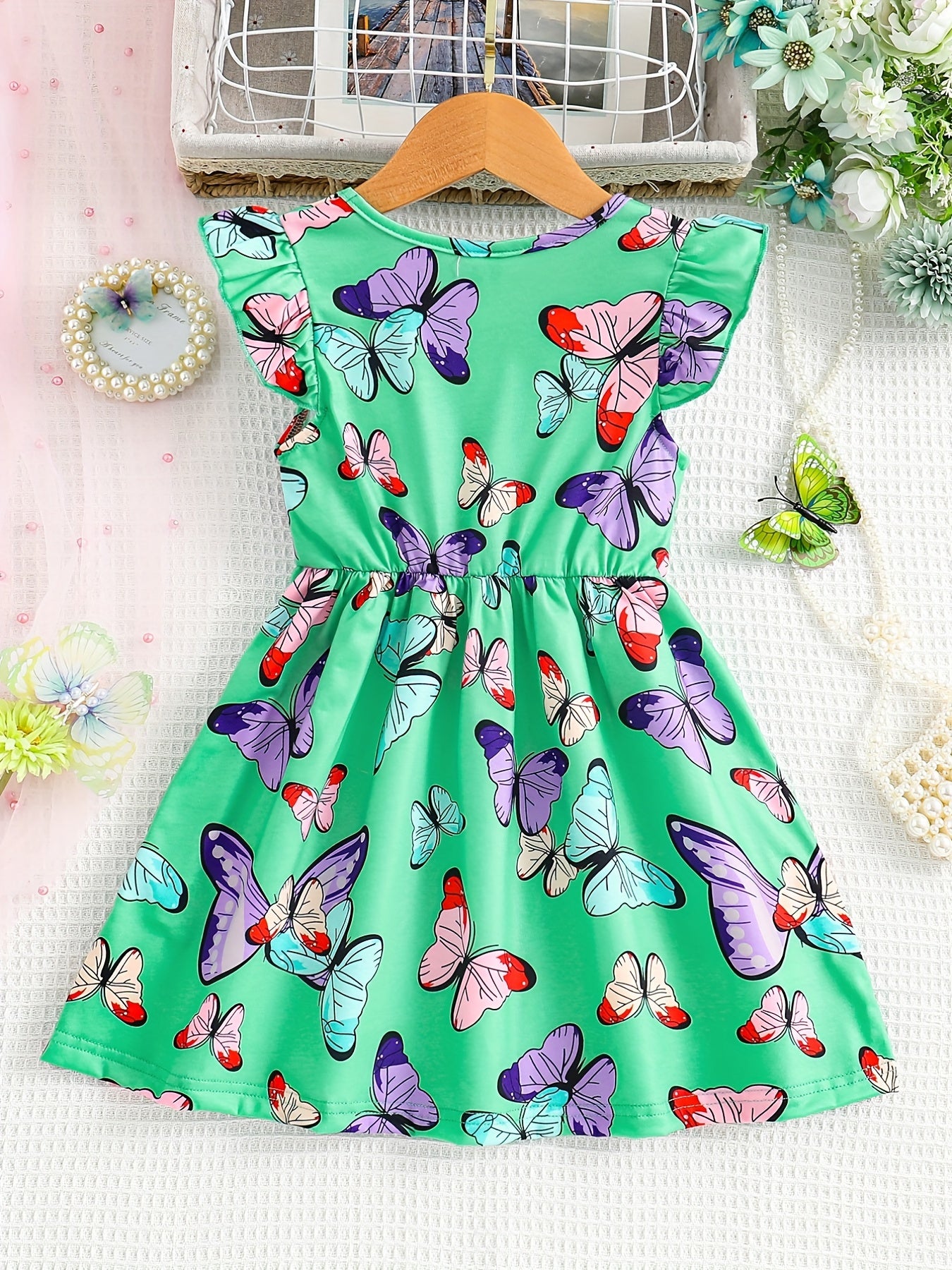 Girls' Sleeveless Butterfly Print Dress - Vibrant Purple Knee-Length Loose Fit with Ruffled Hem, Lightweight Summer Dress for Youngsters & Toddlers, Butterfly Print Dress, Youngsters'S Playwear, Playful Youngsters'S Fashion,
