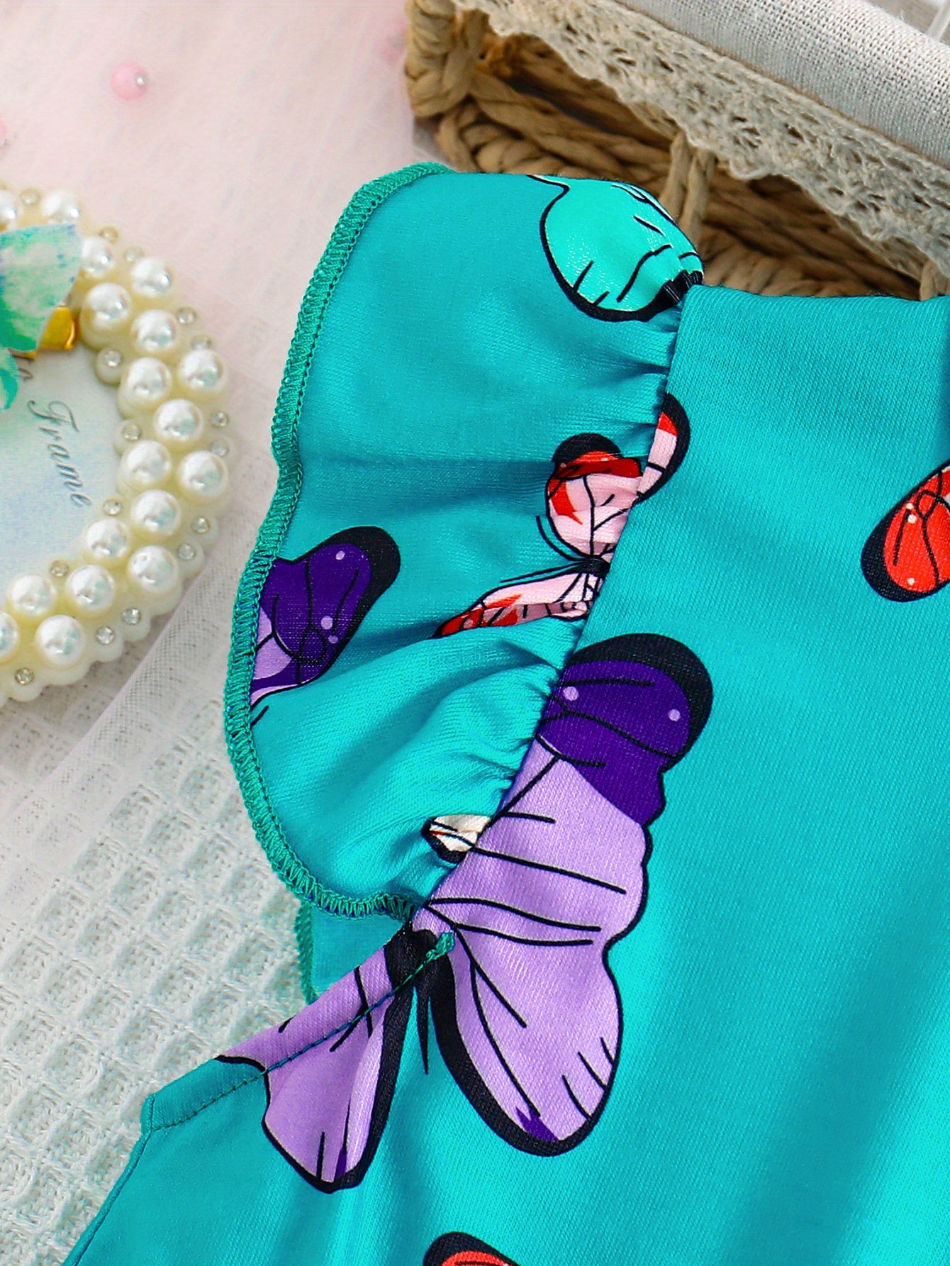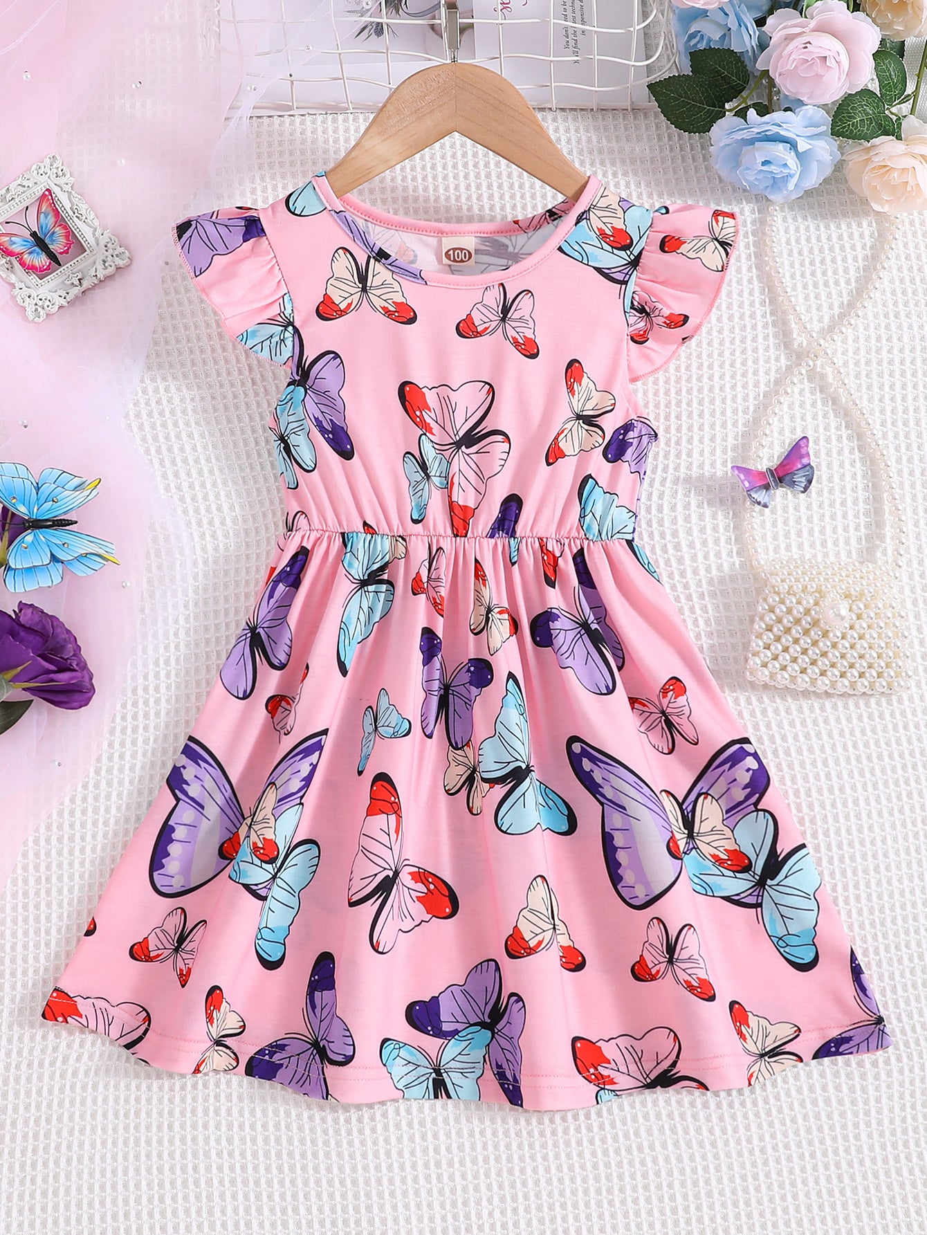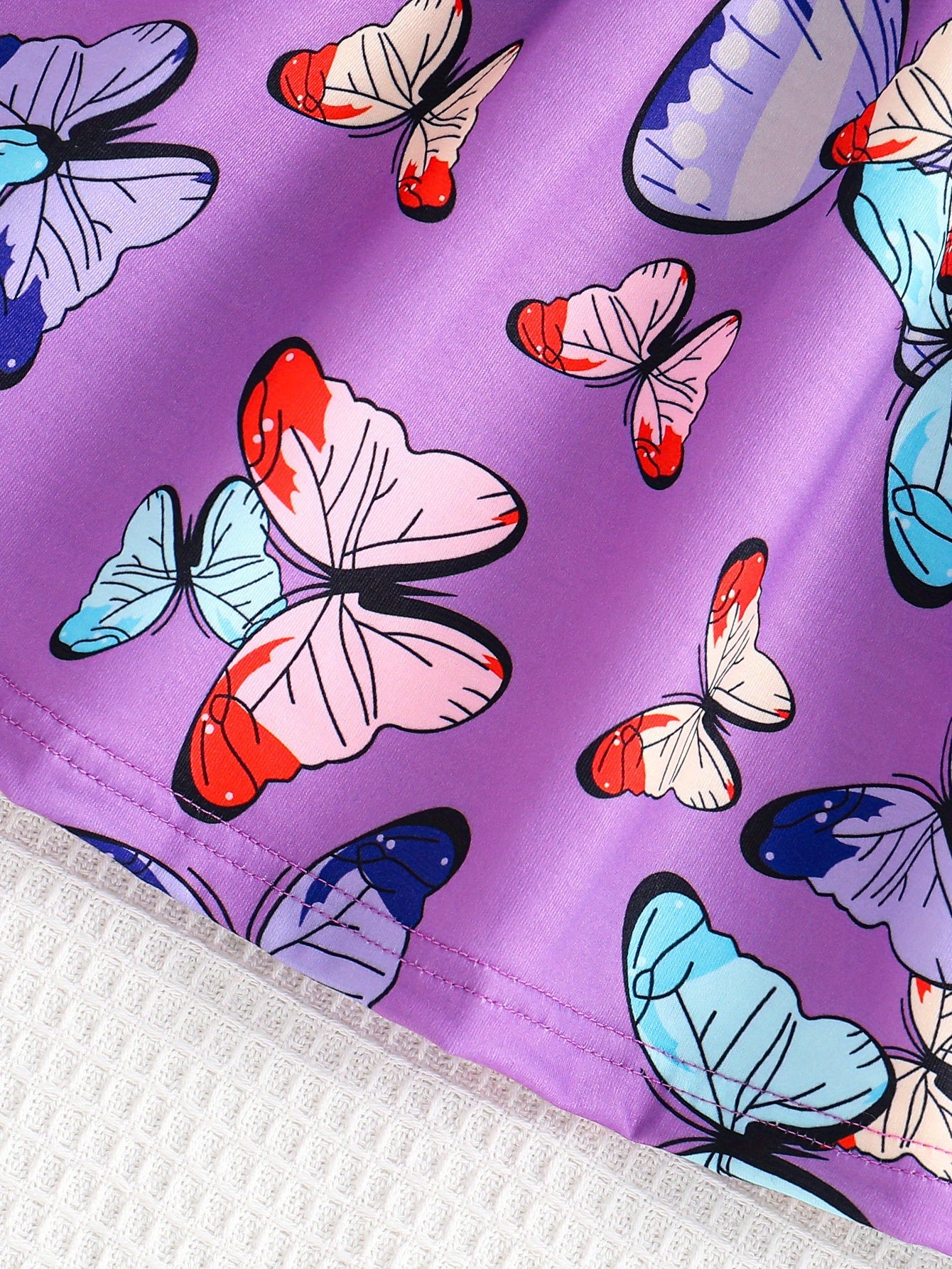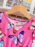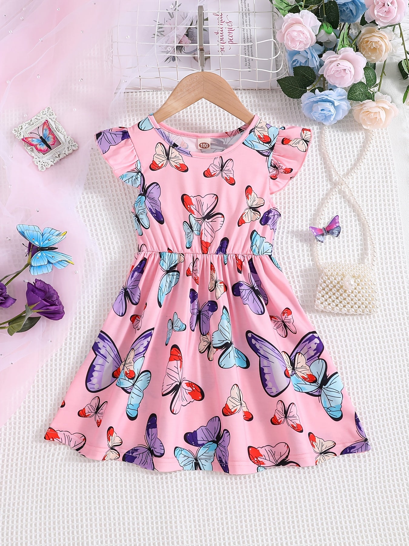 Girls' Sleeveless Butterfly Print Dress - Vibrant Purple Knee-Length Loose Fit with Ruffled Hem, Lightweight Summer Dress for Youngsters & Toddlers, Butterfly Print Dress, Youngsters'S Playwear, Playful Youngsters'S Fashion,