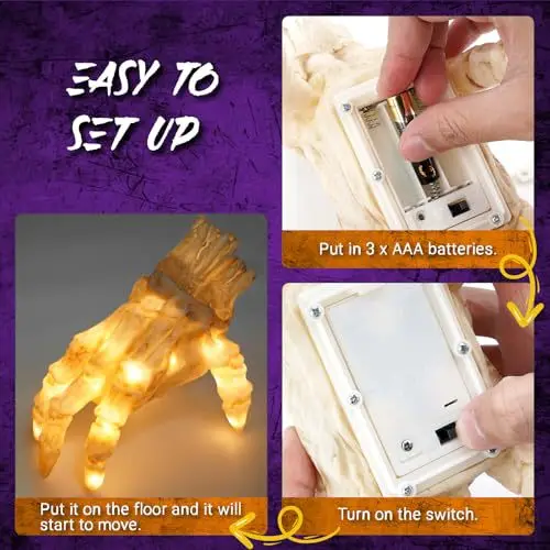 3.Battery Powered Convenience: The crawling hand is powered by batteries. Open the battery cover on the bottom of the hand, insert three AAA batteries, and turn on the switch to operate easily.