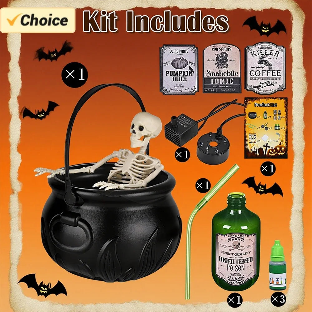 Witches cauldron (8"x5"), bottle, 3 bottles of dye paint, water pump, fog machine, stickers, skeleton skull prop + adjustable umbrella baffle, 5-minute installation video guide