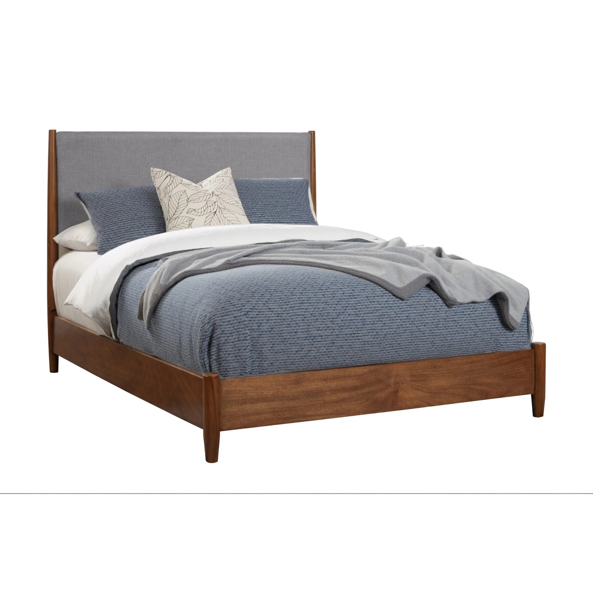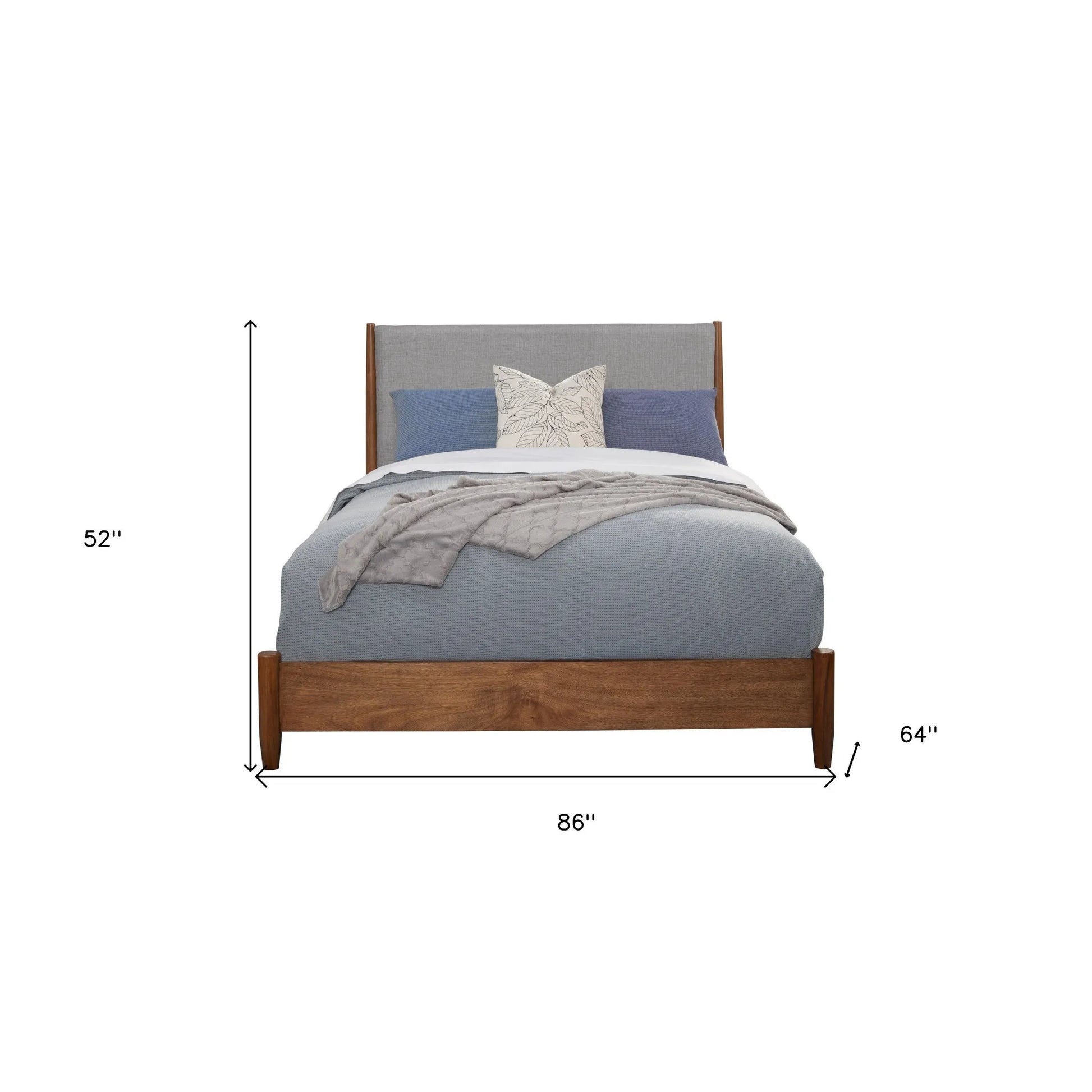 Create a haven for relaxation and sweet dreams with this fabulous brown and gray solid wood and linen queen bed frame. Partially upholstered in a gray, rugged linen, this bed brings a unique and designer perspective to your space. Quality craftsmanship in every facet of production ensures durability and long-lasting wear. This bed is the perfect way to make your bedroom comfortable and inviting. Inspired by mid-century design elements, this bed will add a clean and fashionably look to your space. 52-inch h x 86-inch w x 64-inch d.
