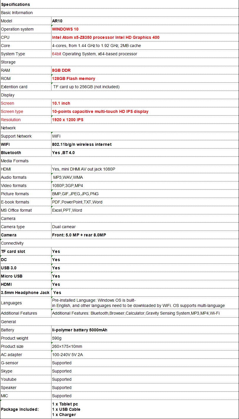 Hot Sales 64 Bit 10.1 INCH X5-Z8350 CPU AR10 Windows 10 Tablet 8GB DDR RAM 128GB ROM 1920 x 1200 IPS Screen WIFI HDMI-Compatibe