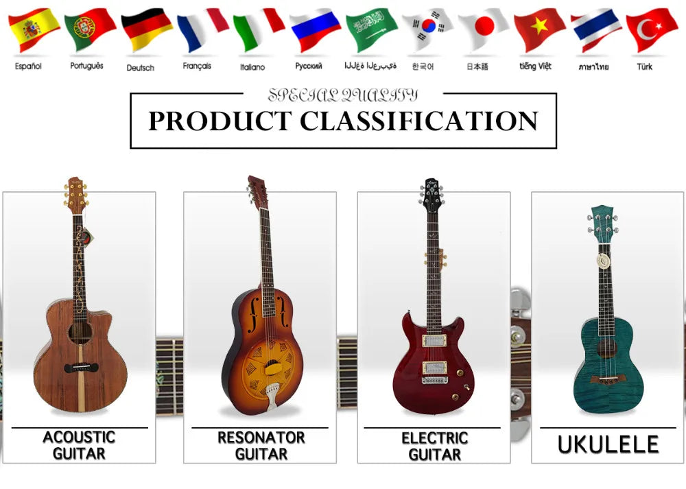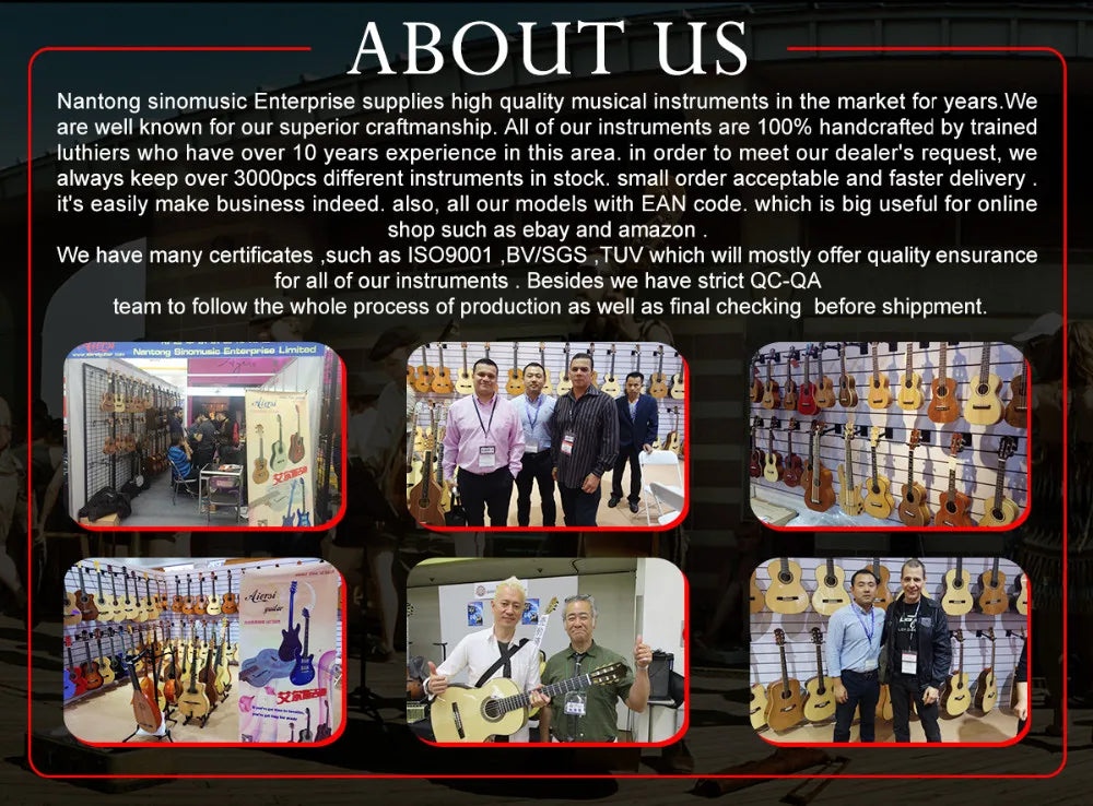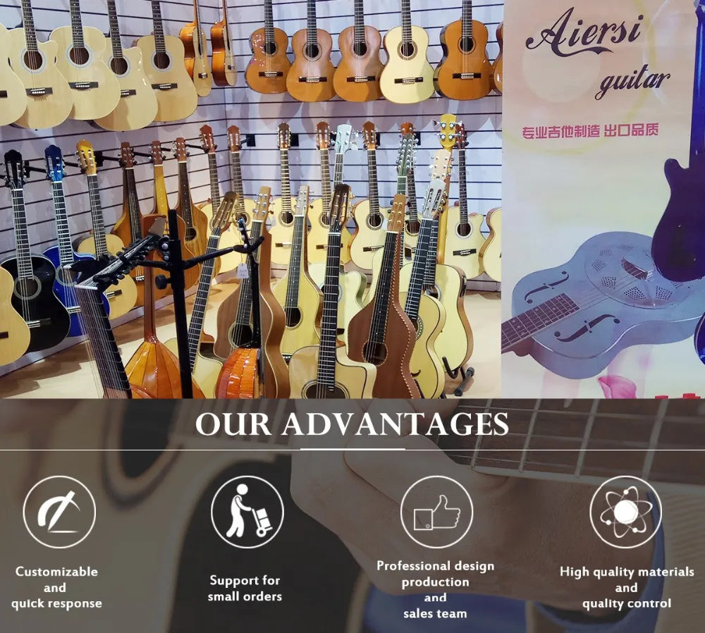 As Chinese top brand for guitar, bass and ukulele. Aiersi brand is hot sale by dealers over 30 countries. we are the only supplier to make wholeline guitar, bass in China. especially we can make hawaiian guitar,gypsy guitar,resonator guitar,double top guitar,smallman guitar and flamenco guitars.because of factory, we also provide OEM ODM Service too.